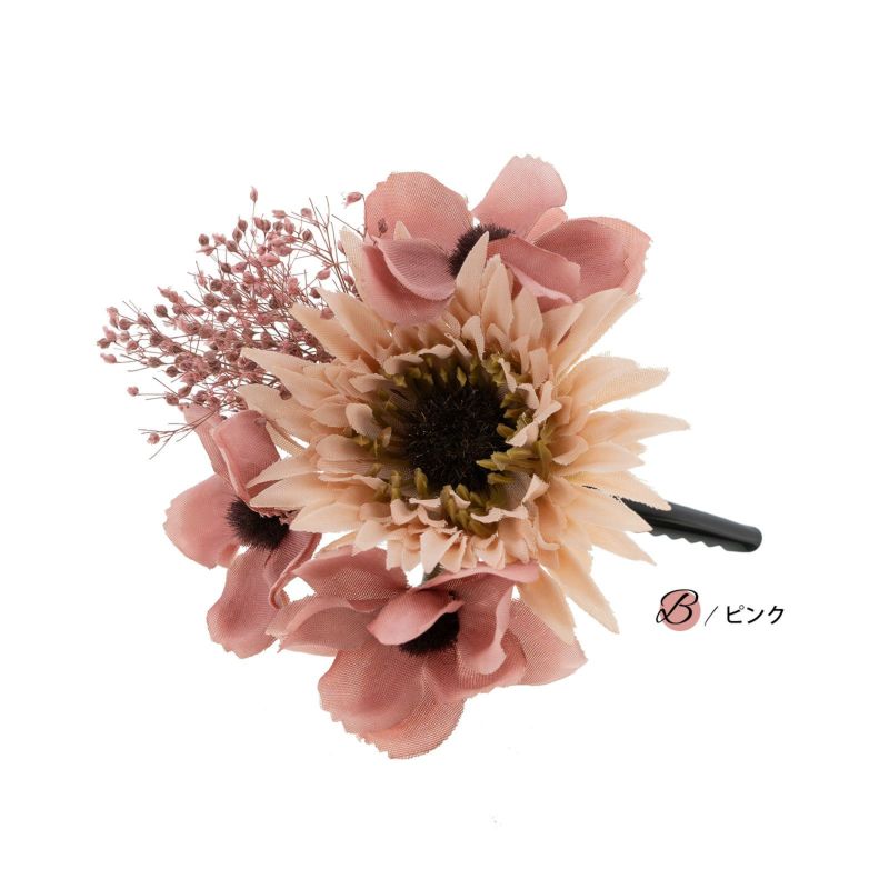 B.ピンク…くすんだ淡いピンクの花びらにこげ茶色の蕊のガーベラ、浅い赤紫の花びらにこげ茶色の蕊の小花、赤紫色のカスミソウを組み合わせクリップ。