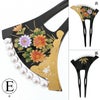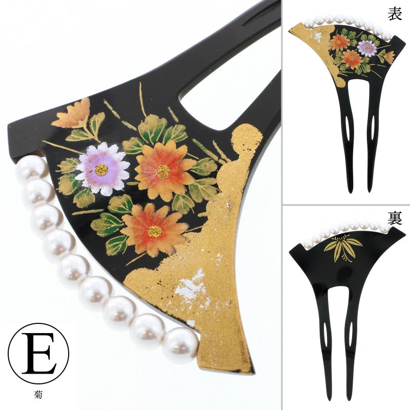 E菊:黒色の台。金彩の雲に淡い朱色や薄紫の菊の花。白色系のパールビーズがついています。