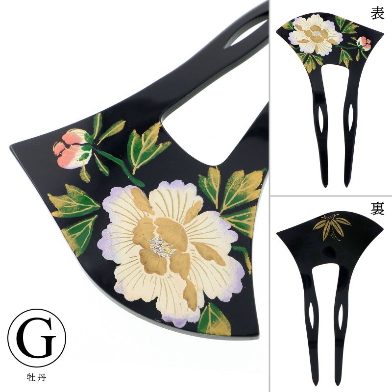 G牡丹:黒色の台。ところどころ金彩やラメをあしらった大きな牡丹。白に藤色のぼかしの花と、白とピンクのつぼみ。