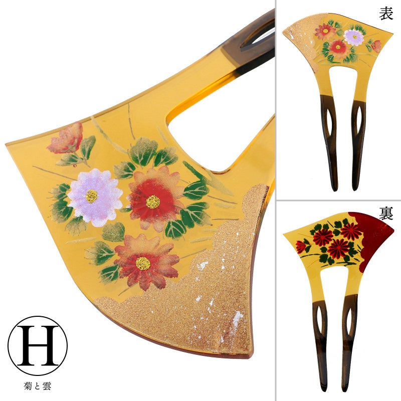 H菊と雲:透明感のある山吹色の台。挿す部分は黒茶色。金色の雲と薄い朱色や藤色の小菊。