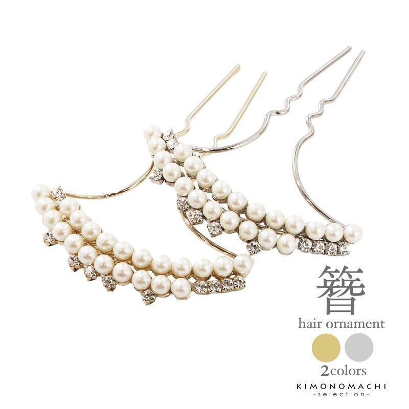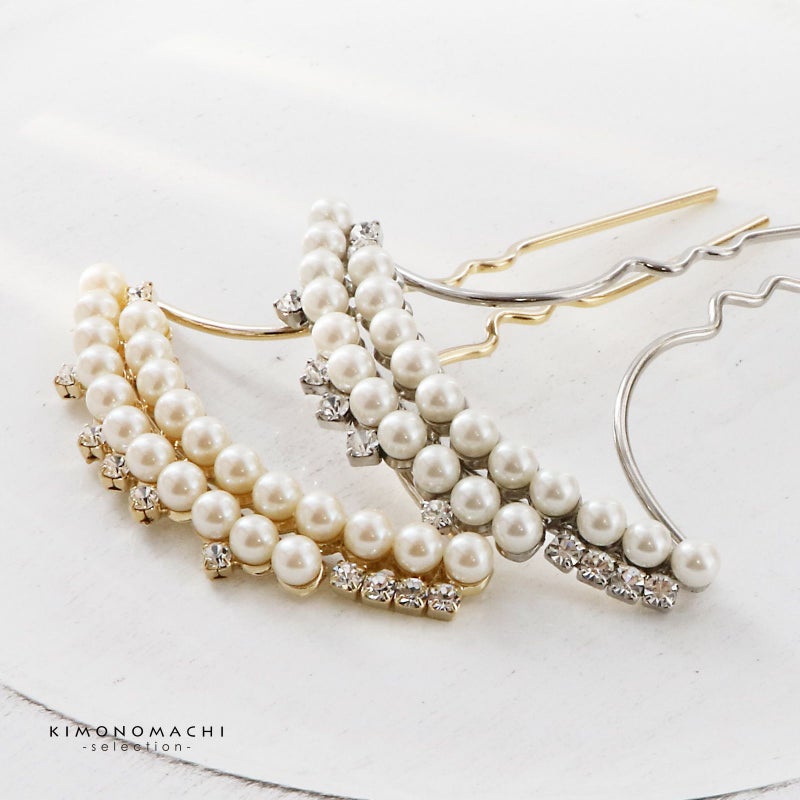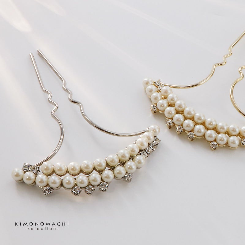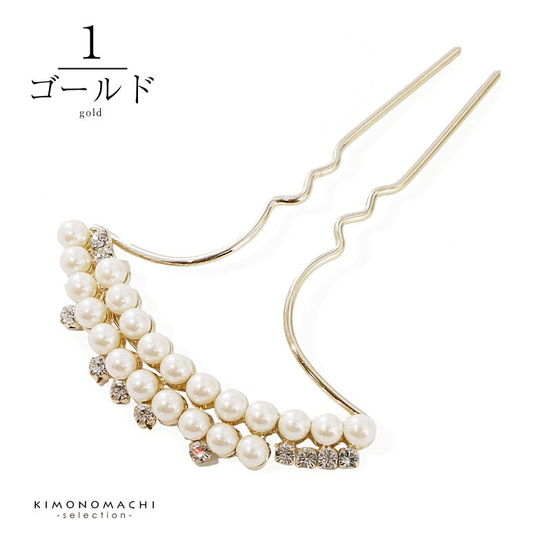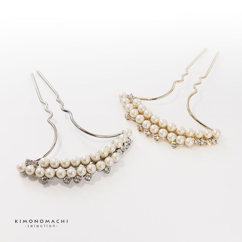 髪飾り かんざし 単品「ゴールド・シルバー 2連パール、ラインストーン」日本製 簪 日本髪 和装 着物 礼装 結婚式【メール便不可】