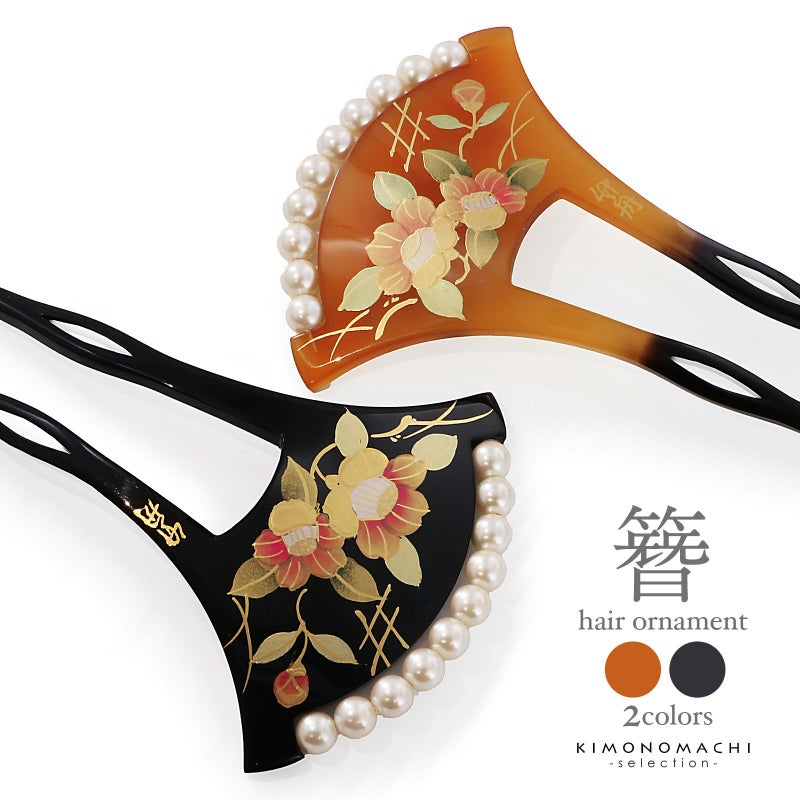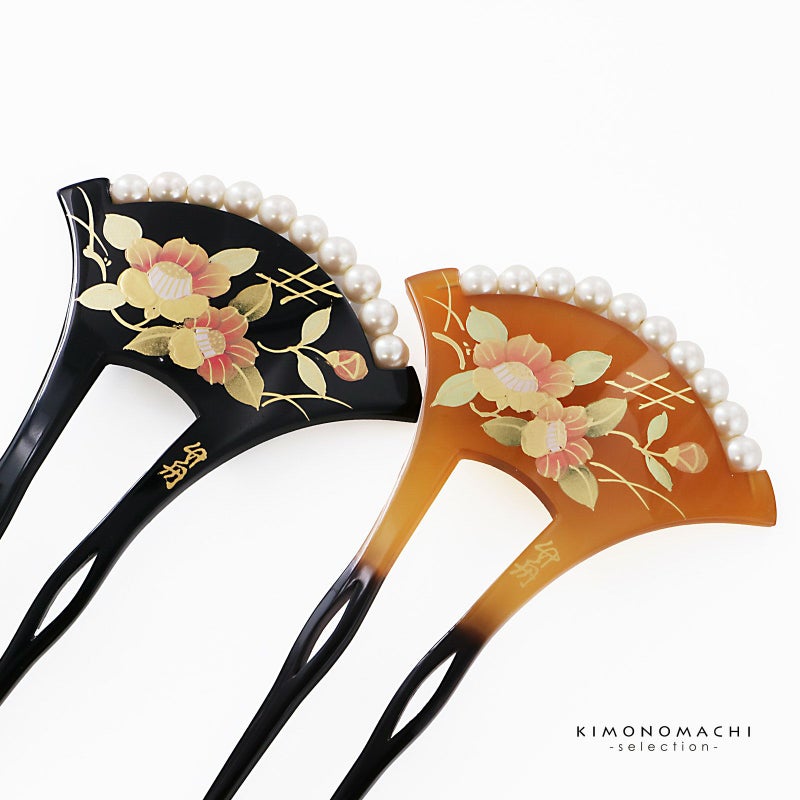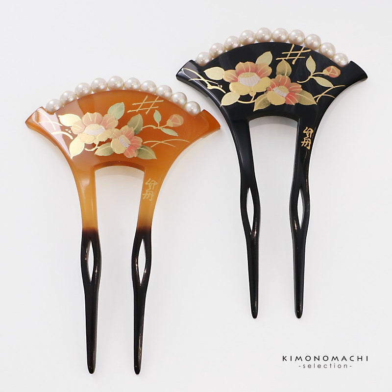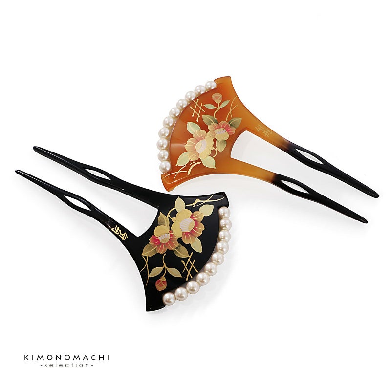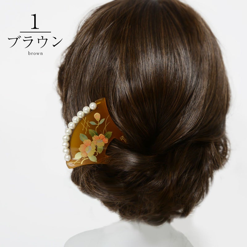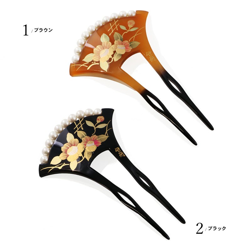 1.ブラウン:透明感のある山吹色の台。挿す部分は黒茶色。紅色、抹茶色、金彩の椿の花。露芝に垣。白色系のパールビーズがついています。
