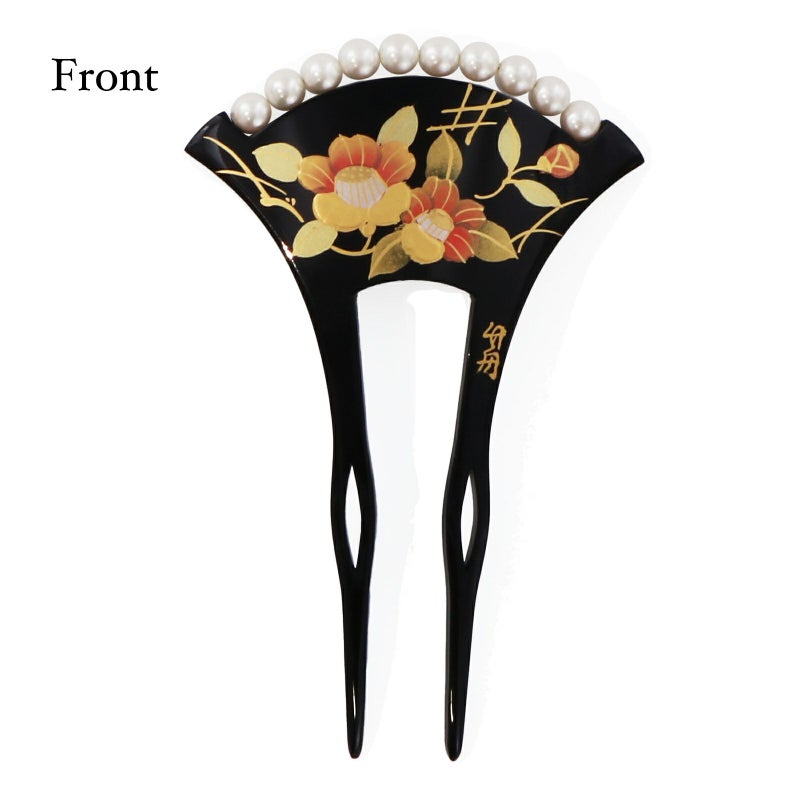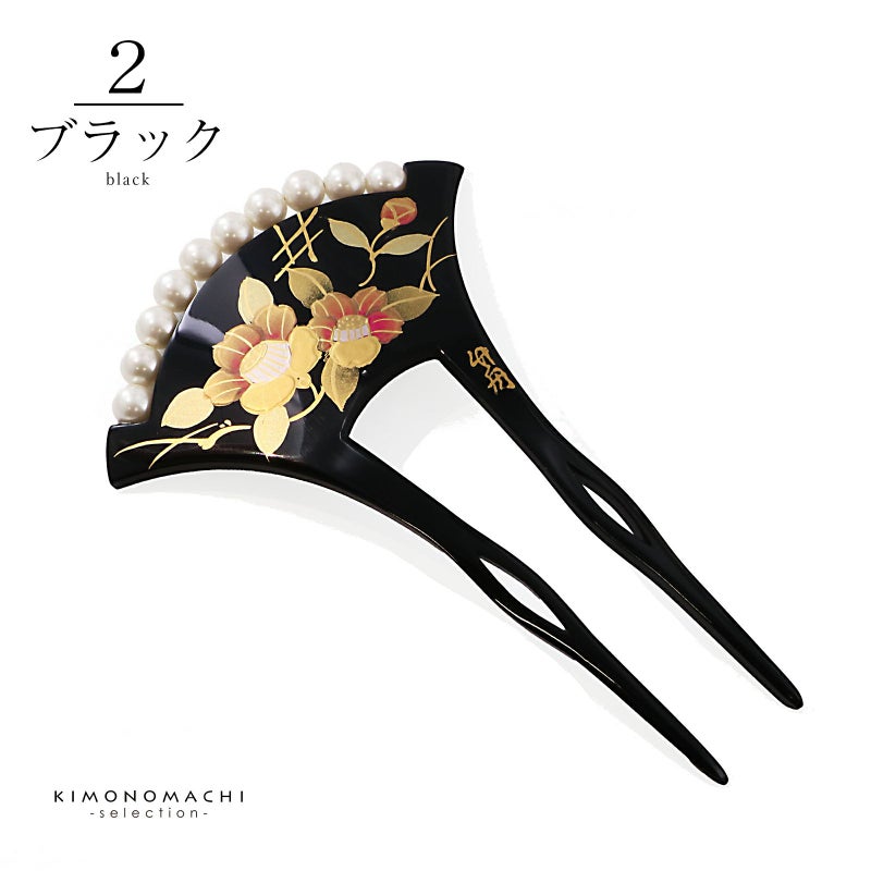 2.ブラック:黒色の台。薄紅色、抹茶色、金彩の椿の花。露芝に垣。白色系のパールビーズがついています。