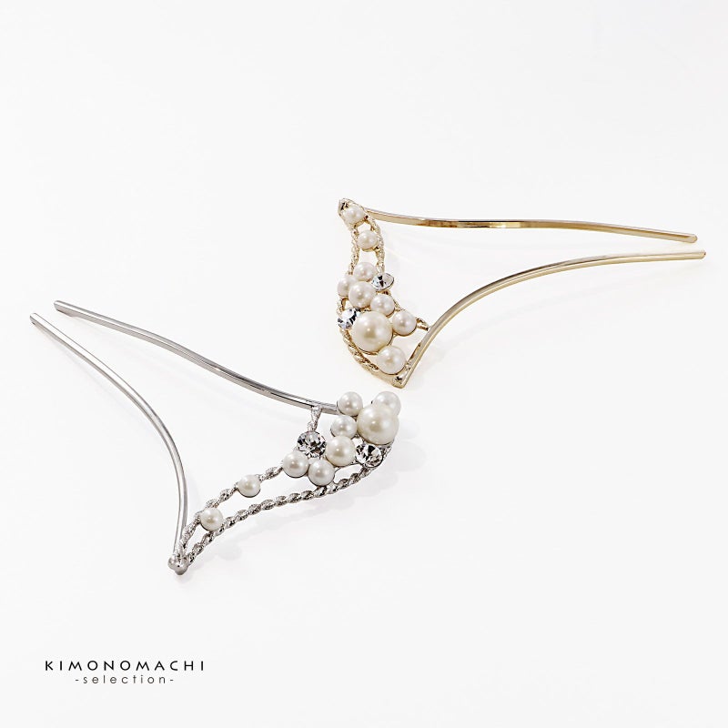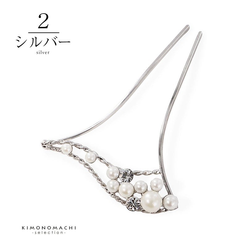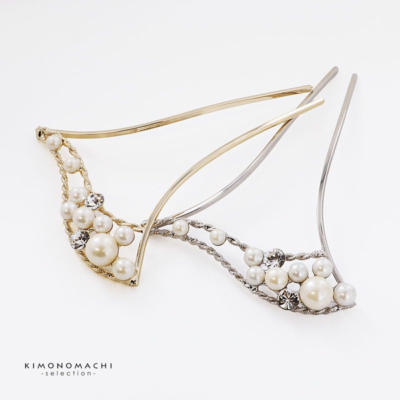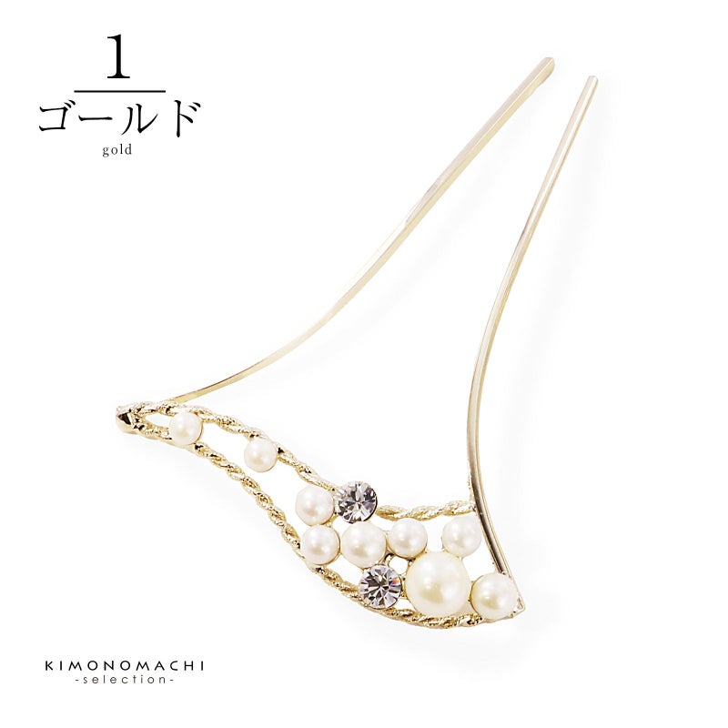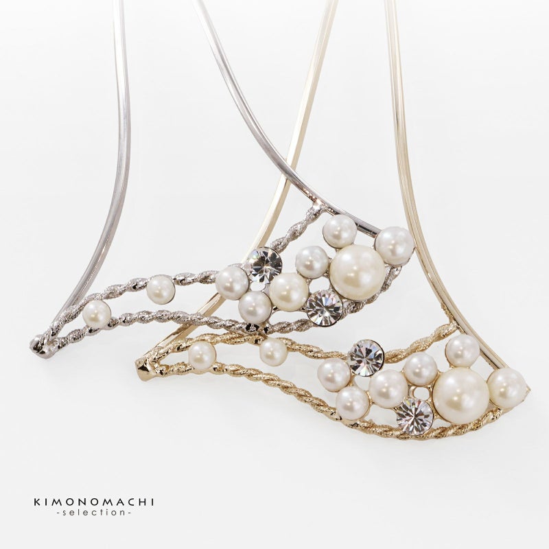 髪飾り かんざし 単品「ゴールド・シルバー パール、ウェーブ」日本製 簪 日本髪 和装 着物 礼装 結婚式【メール便不可】