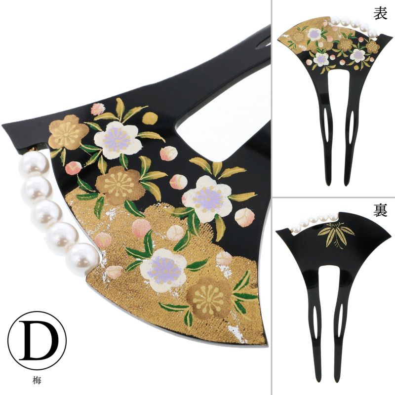 D梅:黒色の台。金彩の雲に淡い紫色と白の梅の小花。白色系のパールビーズがついています。