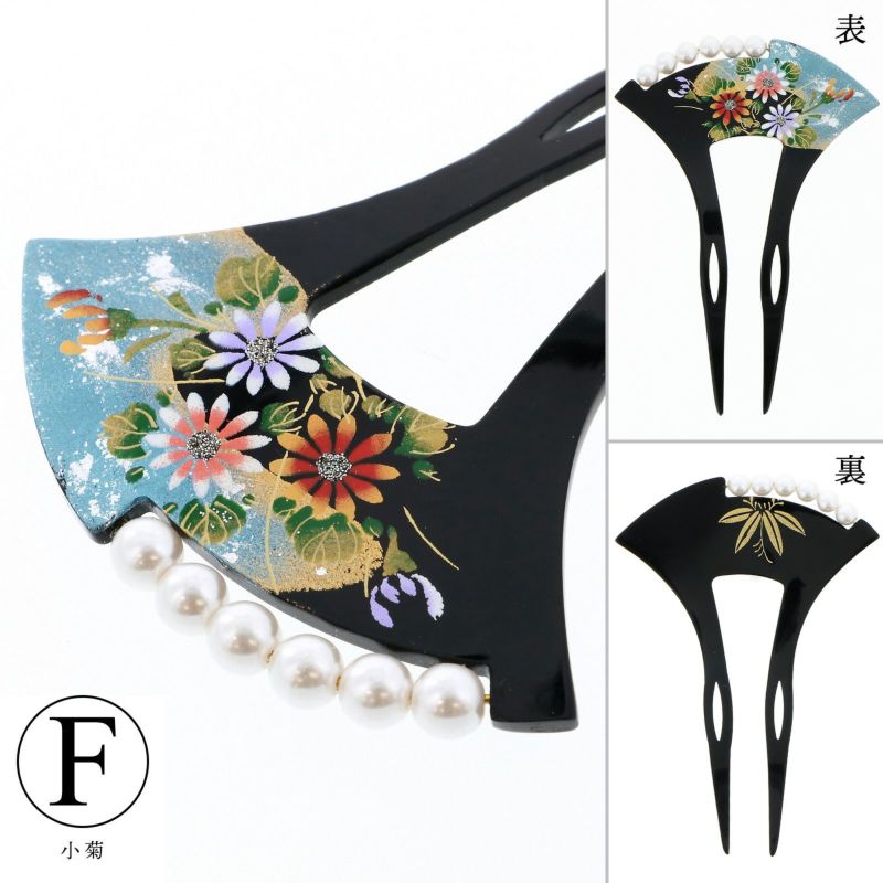 F小菊:黒色の台。金彩と水色の州浜淡に朱色や薄紫の菊の花。白色系のパールビーズがついています。