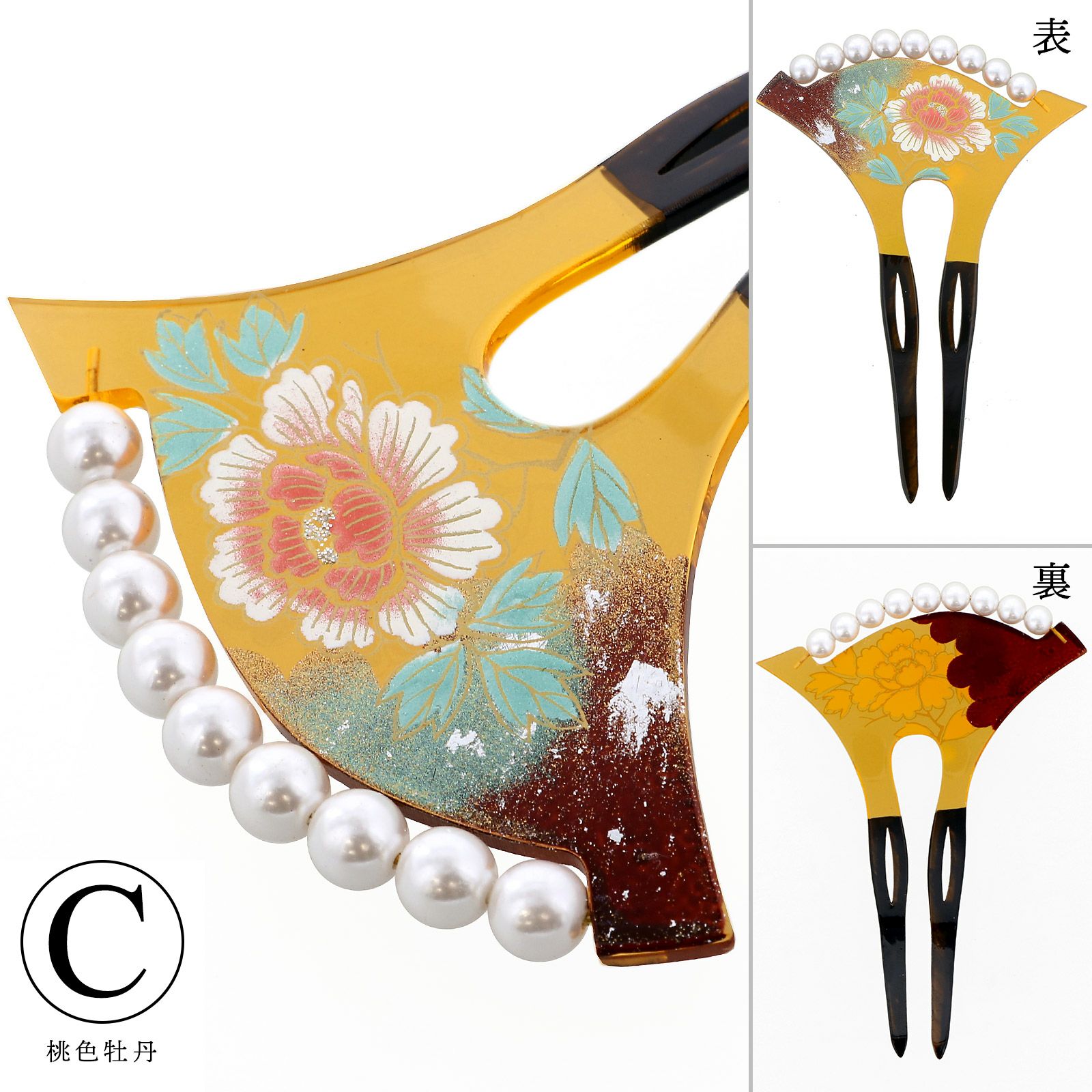 C桃色牡丹:透明感のある山吹色の台。挿す部分は黒茶色。銅褐色の雲に白と桃色の牡丹の花、青磁色の葉。白色系のパールビーズがついています。