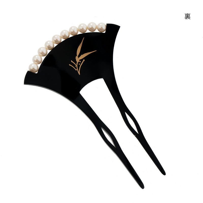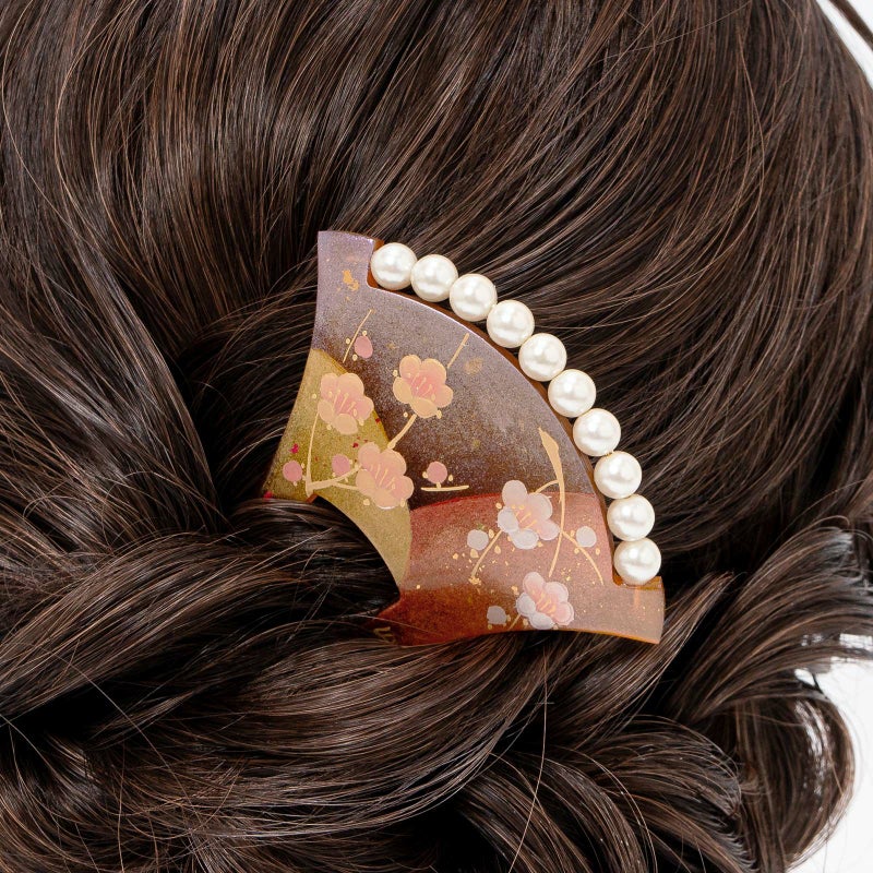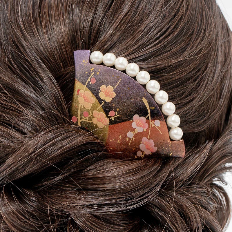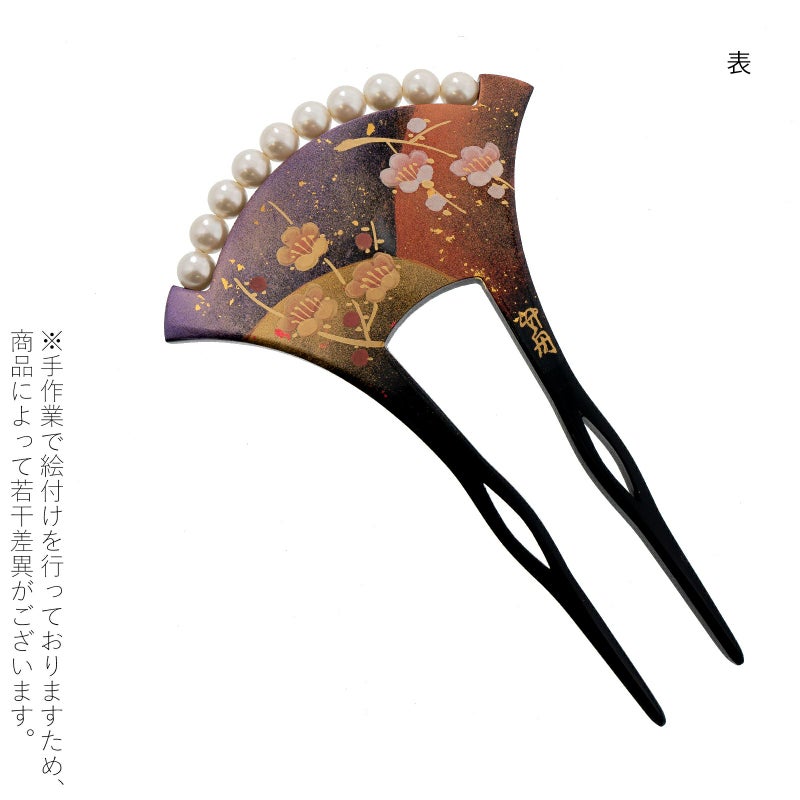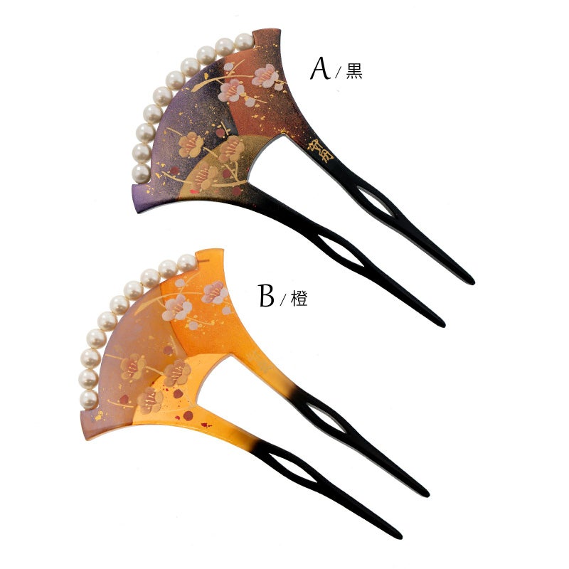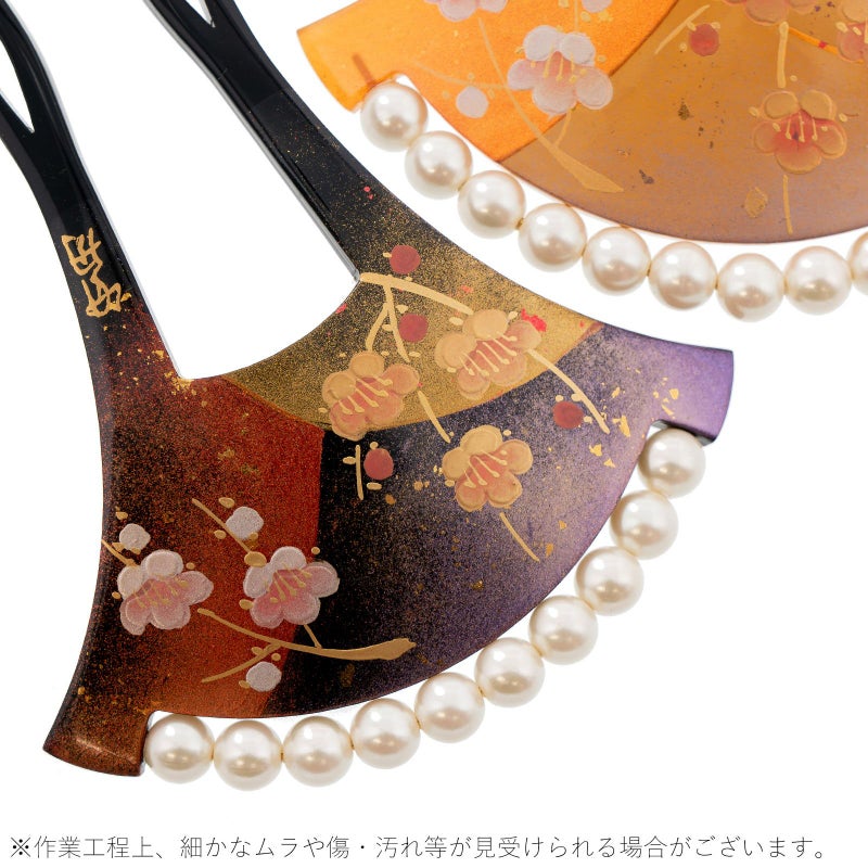A.黒:黒色の台。淡い紫、薄紅色、金彩のぼかしの塗分け地に淡いピンクと金彩の枝梅。白色系のパールビーズがついています。