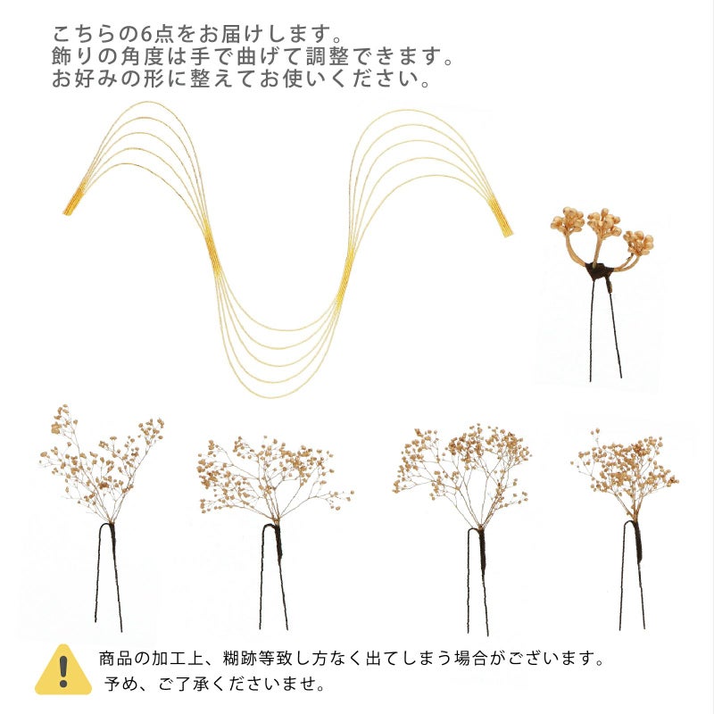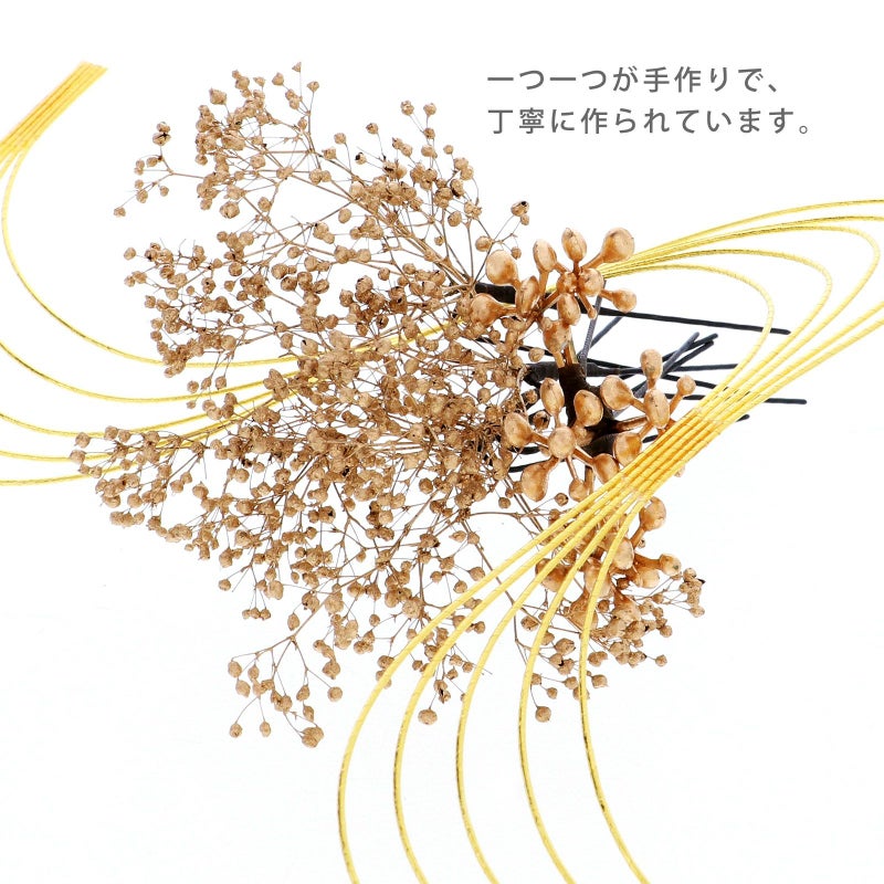 【カラー】ブロンズのカスミソウのUピン4点、ブロンズの花芽のUピン1点、5本組のゴールドの水引のヘッドパーツ1点。おしゃれなデザインの化粧箱入り。