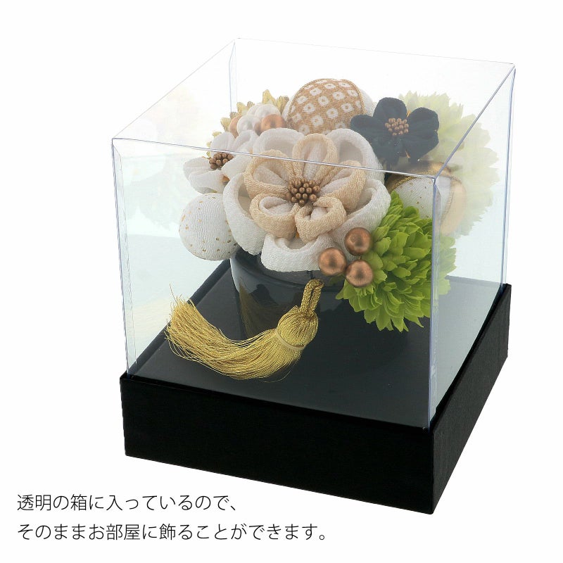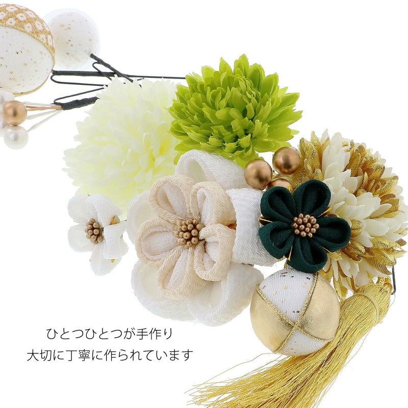 【カラー】つまみのお花・大は白にベージュ、ブロンズの花芯、小は深い緑と白が1点ずつ。ポンポンマムのような造花は、淡いクリーム色、クリーム色と金、黄緑色が各1点。玉飾りの大は白に金の鹿の子にラメ模様、中は白地に金とゴールド、小は白地に金のラメ。ビーズ飾りはパールとブロンズを組み合わせたもの、ブロンズビーズが1点ずつ。明るい金色のタッセル飾り。