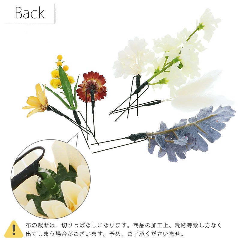 ポリエステル、ポリエチレン、スチロール、レーヨン、自然素材(ドライフラワー)、鉄(Uピン、コーム)