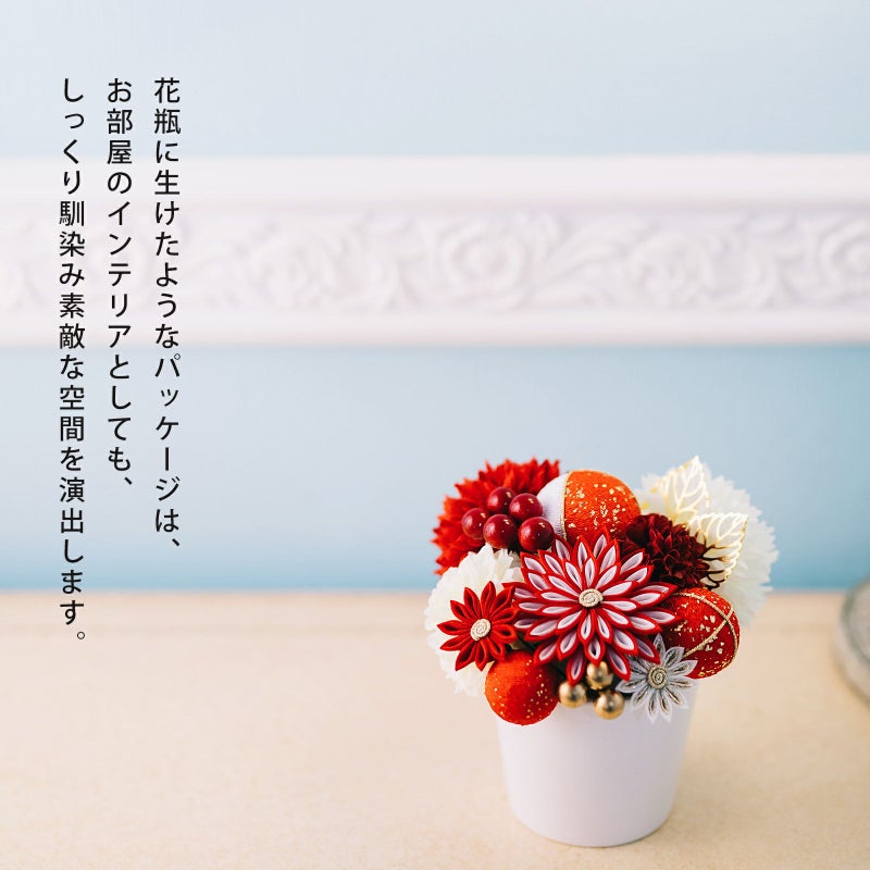 赤:赤と白の剣つまみ、ゴールドの蕊の大花八重菊が1点、小花は赤の剣菊1点、白とゴールドの剣菊1点。マム・大は落ち着いた赤1点、中はクリーム色1点、小はオフホワイト1点。玉飾り・大は赤地に金ラメと白のちりめんを組み合わせ、金糸の縁取り。中は赤地に金ラメ、金糸の縁取り。小は赤地に金ラメ。ビーズ飾りはつやのある赤5粒が1点、ブロンズビーズ3粒が1点。ゴールドの透かしモチーフの葉が2点。ゴールドのタッセル1点。
