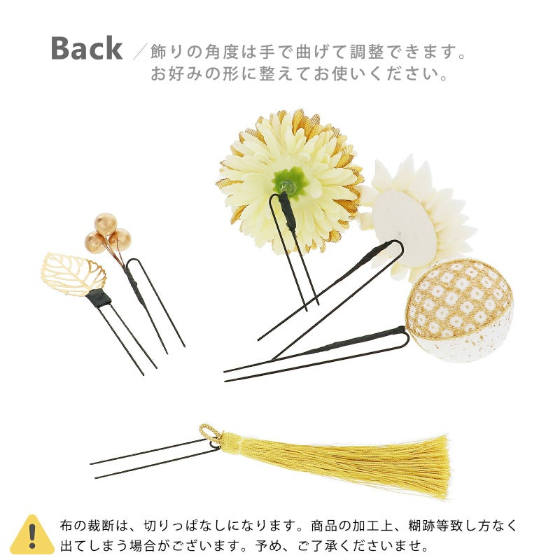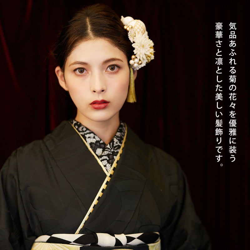 白:白とクリーム色の剣つまみ、ゴールドの蕊の大花八重菊が1点、小花は白の剣菊1点、白とゴールドの剣菊1点。クリーム色とゴールドを組み合わせたマム・大が1点、中はクリーム色1点、小はオフホワイト1点。玉飾り・大は白地に金ラメと金の鹿の子模様を組み合わせ、金糸の縁取り。中はゴールド地と白地に金ラメ、金糸の縁取り。小は白地に金ラメ。ビーズ飾りはつやのあるパールとブロンズを組み合わせた5粒と、ブロンズビーズ3粒が1点ずつ。ゴールドの透かしモチーフの葉が2点。ゴールドのタッセル1点。