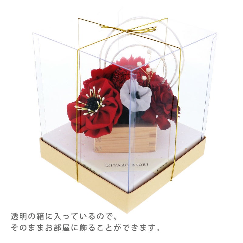 こちらの髪飾りは、Uピン仕様のセットで装着も簡単。ショートヘアからロングヘアまで、髪型を気にせずにお使いいただけます。ヘアスタイルに合わせて、髪飾りのボリュームが調整できます。また、お好みの位置に分けてアレンジが可能です。「祝枡(祝います)」という縁起がよい枡にアレンジしてお届けいたします。