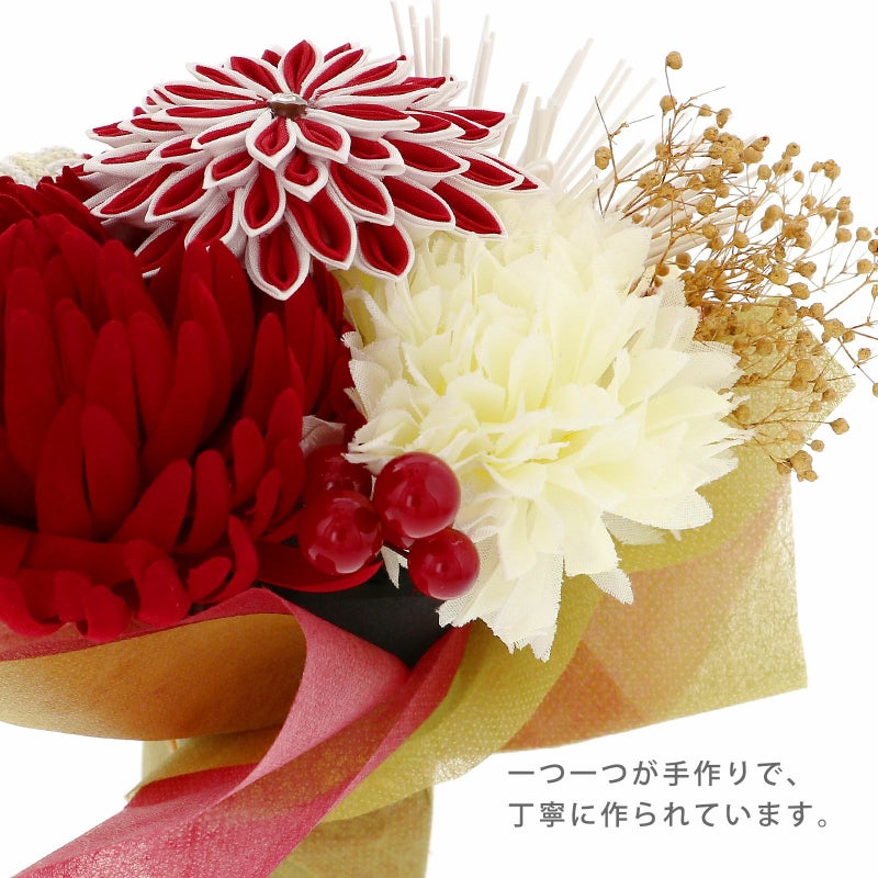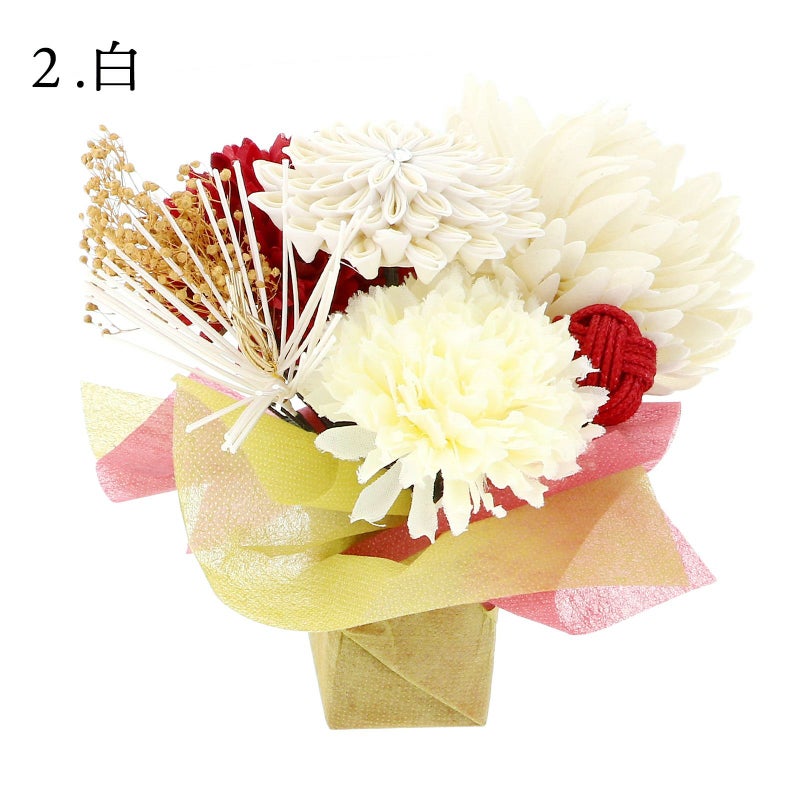 2.白・・・白とクリーム色のつまみの剣菊、オフホワイトの大きなマム、深い赤とオフホワイトのマム、ゴールドのカスミソウ、白の水引の松葉、赤のビーズの実、赤のあわじ玉。