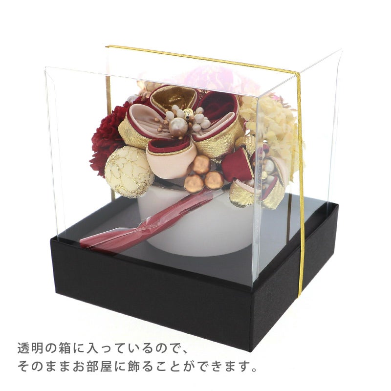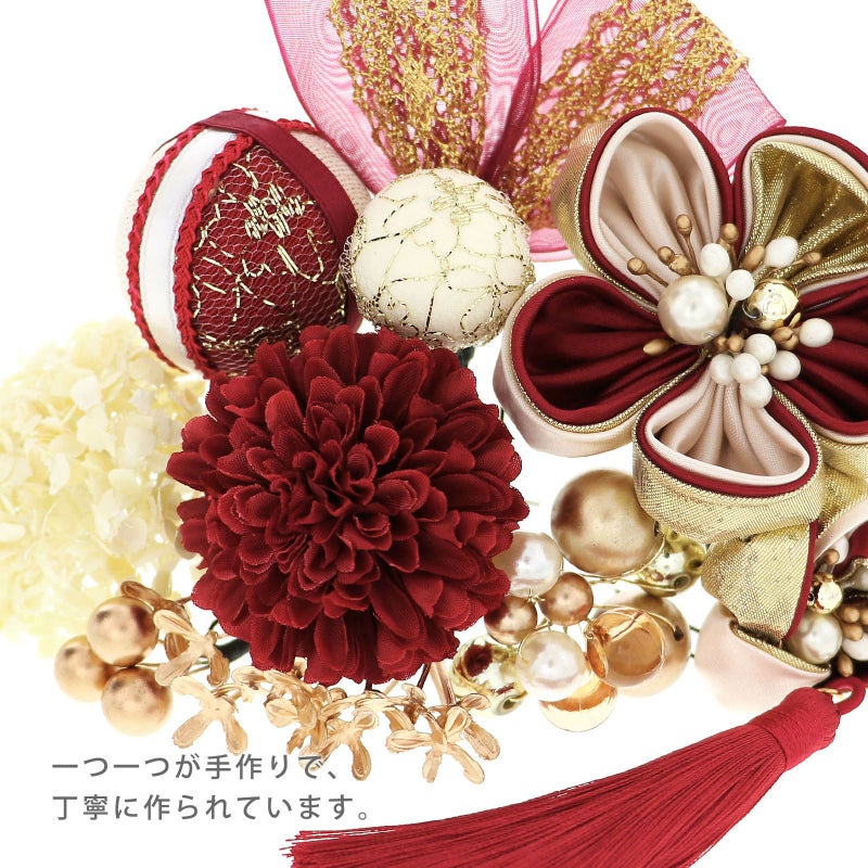 01.レッド:丸つまみの花・大、小は深いワインレッドとベージュ、ゴールドを重ねた花びらに白やブロンズ、パールのペップ。玉飾り・大は白とワインの地にゴールドのレース、赤紫のリボンと白のブレードリボンの縁取り。玉飾り・小はアイボリーにゴールドのチュール。深いワインレッドのマム1点、アイボリーの小花アジサイ1点、ゴールドのアナベル1点、ブロンズゴールド、クリアブラウンのビーズ飾り1点、ブロンズのビーズ飾り・小1点、ワインレッドのタッセル1点、赤紫にゴールドのレースのリボン飾り1点。