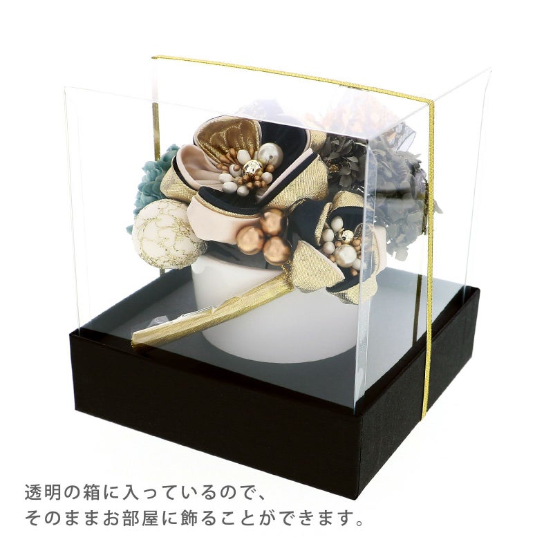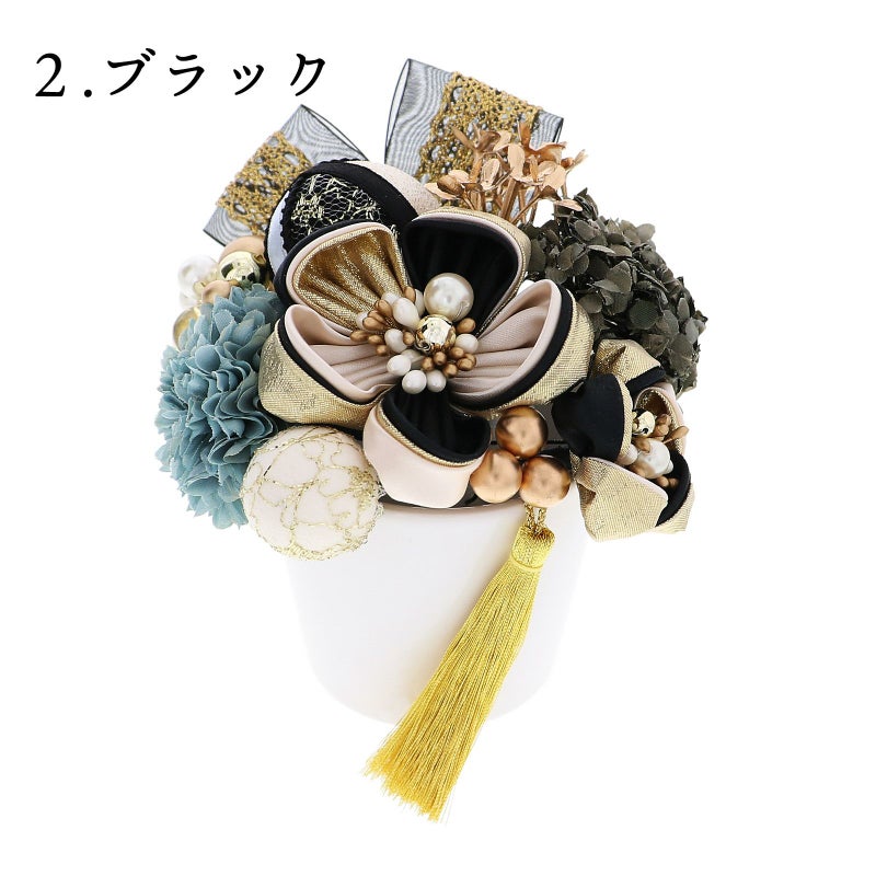 02.ブラック:丸つまみの花・大、小は黒とベージュ、ゴールドを重ねた花びらに白やブロンズ、パールのペップ。玉飾り・大は白と黒の地にゴールドのレース、黒のリボンと白のブレードリボンの縁取り。玉飾り・小はアイボリーにゴールドのチュール。淡い灰青色のマム1点、モスグレーの小花アジサイ1点、ゴールドのアナベル1点、ブロンズゴールド、クリアイエローのビーズ飾り1点、ブロンズのビーズ飾り・小1点、ゴールドのタッセル1点、黒にゴールドのレースのリボン飾り1点。