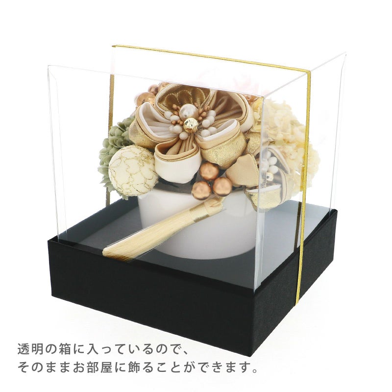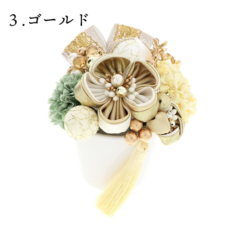 03.ゴールド:丸つまみの花・大、小は白とベージュ、ゴールドを重ねた花びらに白やブロンズ、パールのペップ。玉飾り・大は白地にゴールドのレース、白のリボンとベージュのブレードリボンの縁取り。玉飾り・小はアイボリーにゴールドのチュール。淡い灰緑色のマム1点、クリーム色の小花アジサイ1点、ゴールドのアナベル1点、ブロンズゴールド、クリアブラウンのビーズ飾り1点、ブロンズのビーズ飾り・小1点、アイボリーのタッセル1点、ブラウンにゴールドのレースのリボン飾り1点。