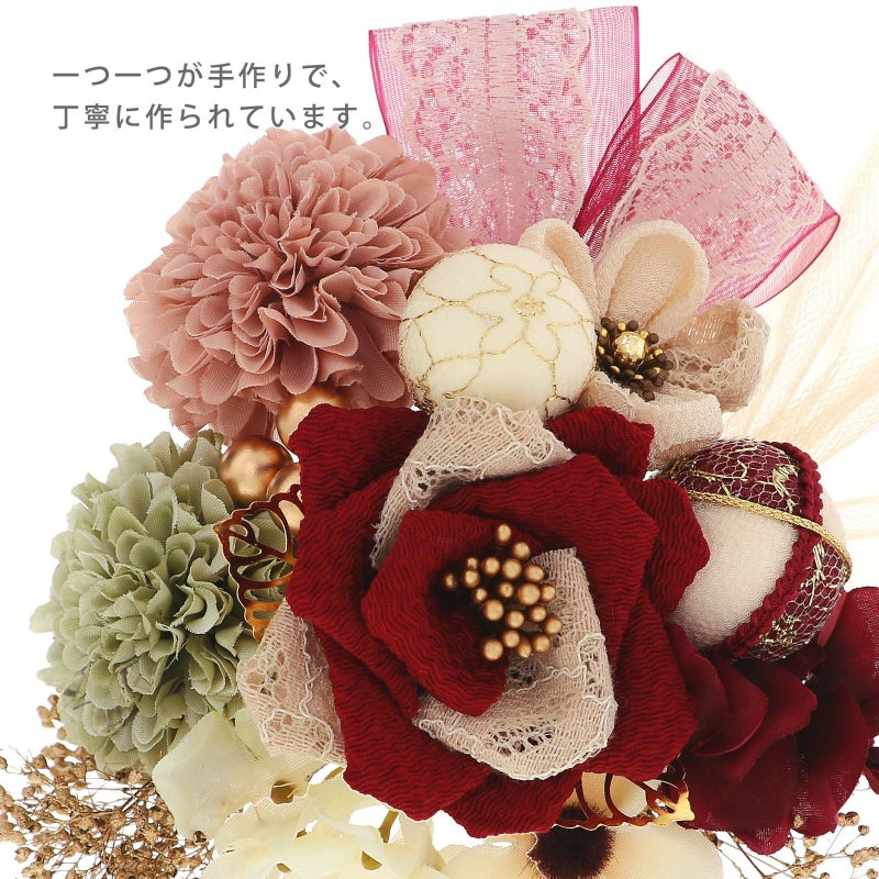 01.レッド:深い赤の縮緬にベージュのレースの花びらの薔薇が1点、淡い灰緑色とくすみピンクのマム各1点、ベージュの縮緬とレースの丸つまみのお花1点、アイボリーにゴールドのチュールを重ねた玉飾り小1点、アイボリーとワイン、チュールを組み合わせた玉飾り中1点、深いワインレッドとオフホワイトのアジサイ各1点、アイボリーの小花、ゴールドのリーフ、カスミソウ、ブロンズのビーズ飾り、ベージュのチュール、ワインレッドに白レースのリボン飾り。