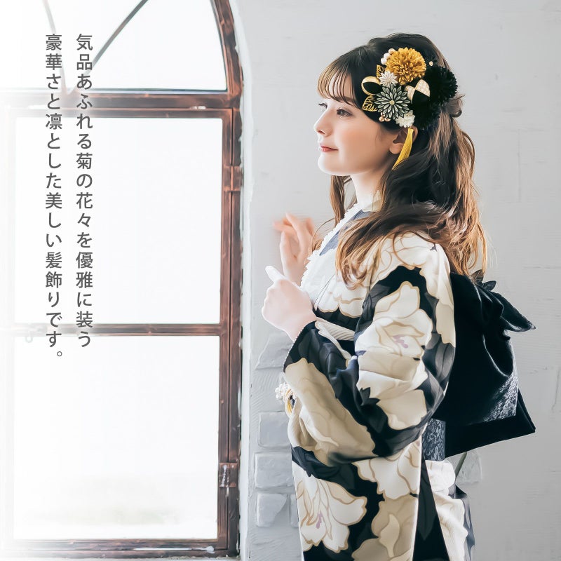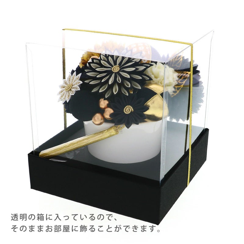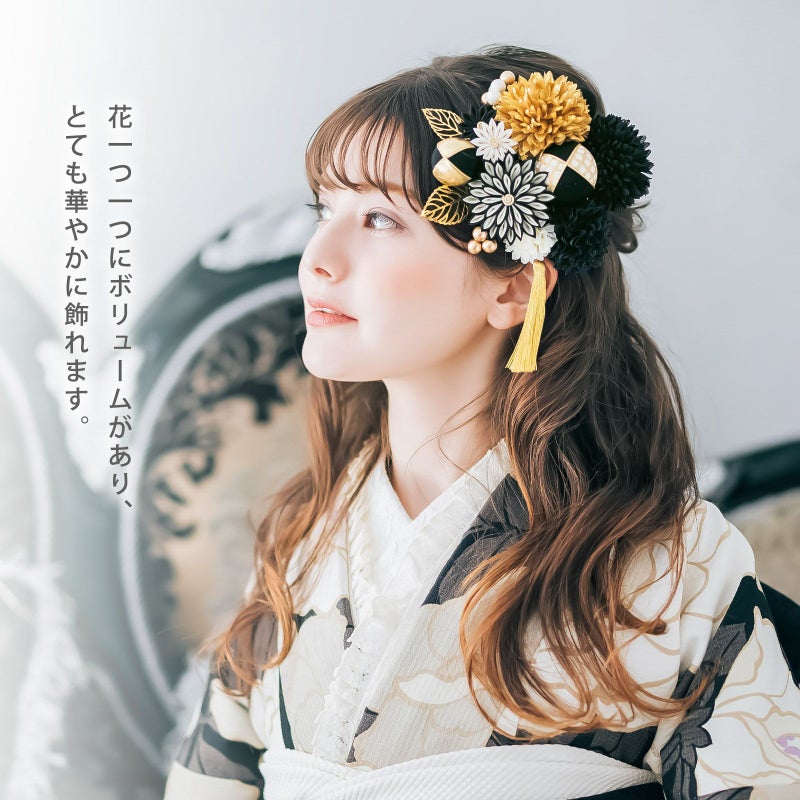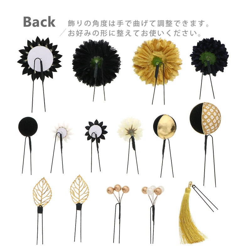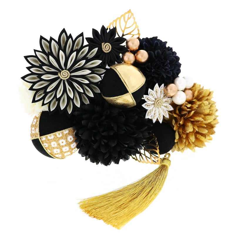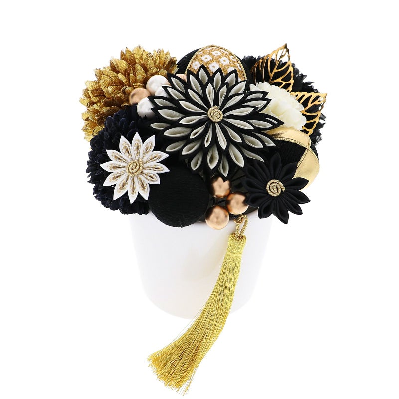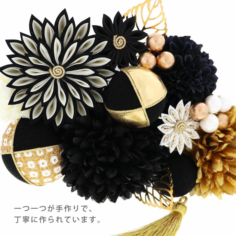 黒:白と黒の剣つまみ、ゴールドの蕊の大花八重菊が1点、小花は黒の剣菊1点、白とゴールドの剣菊1点。マム・大が黒とゴールド各1点、中は黒1点、小はオフホワイト1点。玉飾り・大は黒地と白も金の鹿の子模様を組み合わせ、金糸の縁取り。中はゴールド地と黒地に金糸の縁取り。小は黒地。ビーズ飾りはつやのあるパールとブロンズを組み合わせた5粒と、ブロンズビーズ3粒が1点ずつ。ゴールドの透かしモチーフの葉が2点。ゴールドのタッセル1点。