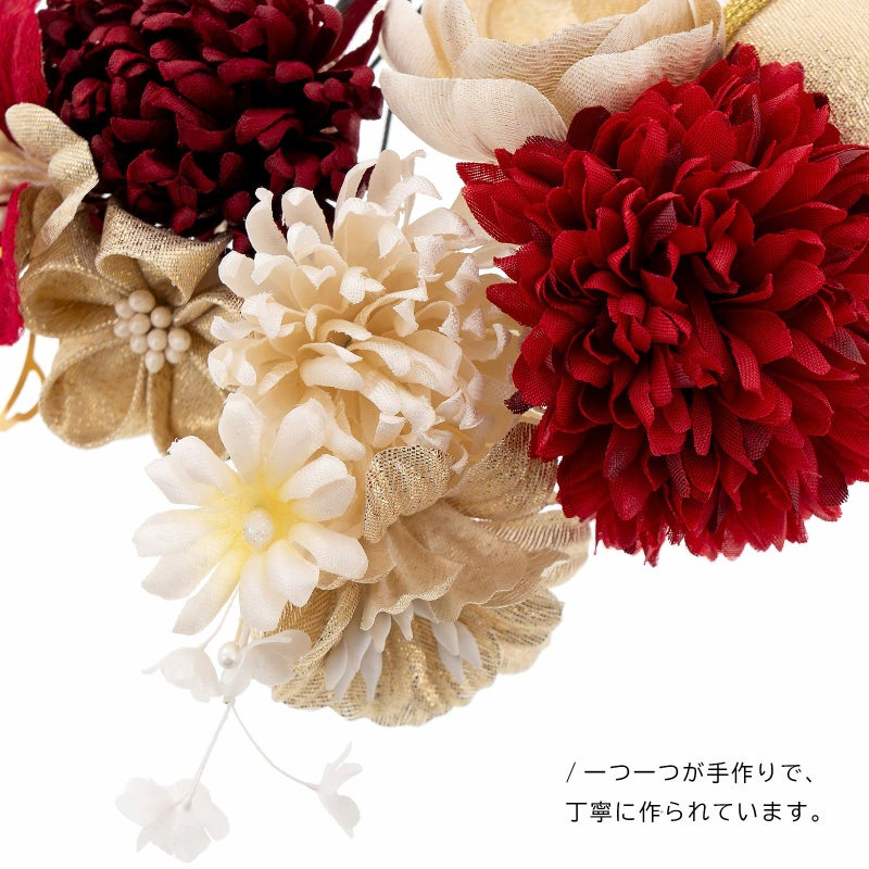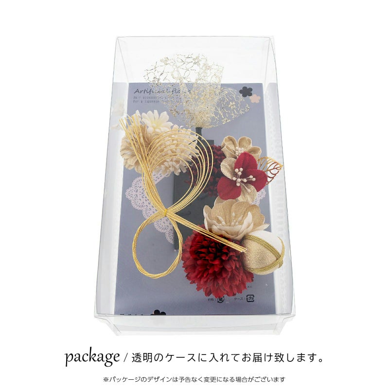 A.赤:深い赤の大マム、ゴールドのお花、ゴールド×白の玉飾りを組み合わせたUピン1点。深い赤の小マム、ゴールドのつまみのお花、赤×ゴールドのお花、ゴールドのメタルリーフのUピン1点。淡いベージュの小マム、ゴールドのお花、白の小花のUピン1点。ゴールドの八の字水引飾りのUピン1点。ゴールドのチュールレースのUピン1点。