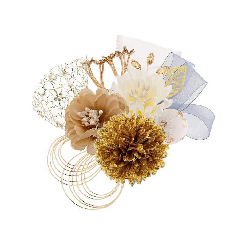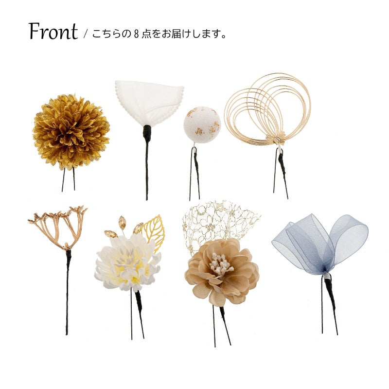 【色柄】ゴールドの大マムのUピン1点。白のお花とゴールドのメタルリーフ、ベージュのビーズのUピン1点。ベージュの花びらに白ラメのペップのお花とゴールドのチュールレースUピン1点。白地に金粉の玉飾りのUピン1点。ブロンズゴールドの小花のUピン1点。ゴールドの水引の輪飾りのUピン1点。白のシフォンリボン飾りUピン1点。淡いブルーグレーのシフォンリボン飾り1点。