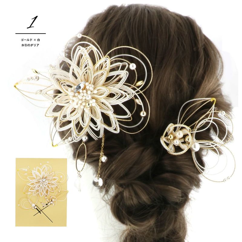 1.ゴールド×白.水引のダリア:白とゴールドの水引で表現された八重のダリアのような花、パールビーズやラインストーン、白のペップの芯、白色系のビーズの下がりの付いたコーム。白とゴールドの水引の梅の花と葉、パールビーズの蕊のUピン1点。白とゴールドの水引の輪、パールビーズのUピン1点。