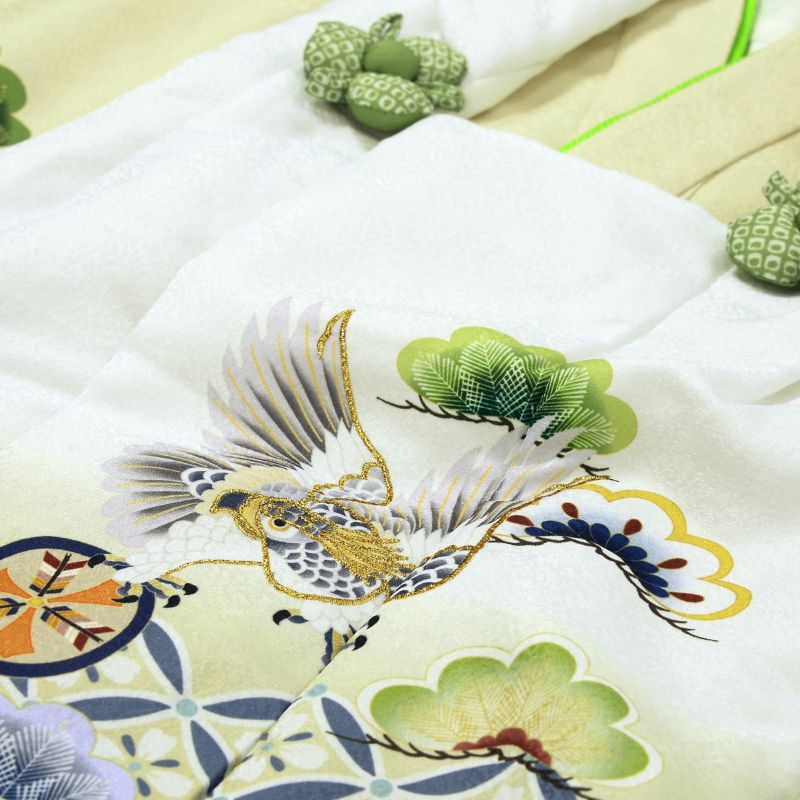 被布コートは白地。淡いグレー系の鷹に緑の松。ポイントにゴールドの刺繍。裾模様に白緑に灰青の七宝文様。被布飾りは抹茶色の鹿の子のつまみのお花。