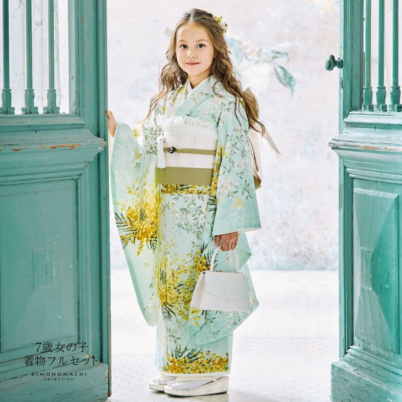 七歳の七五三(四つ身着物)の着付けに必要なものが揃ったフルセットです。お洒落で女の子らしい雰囲気。