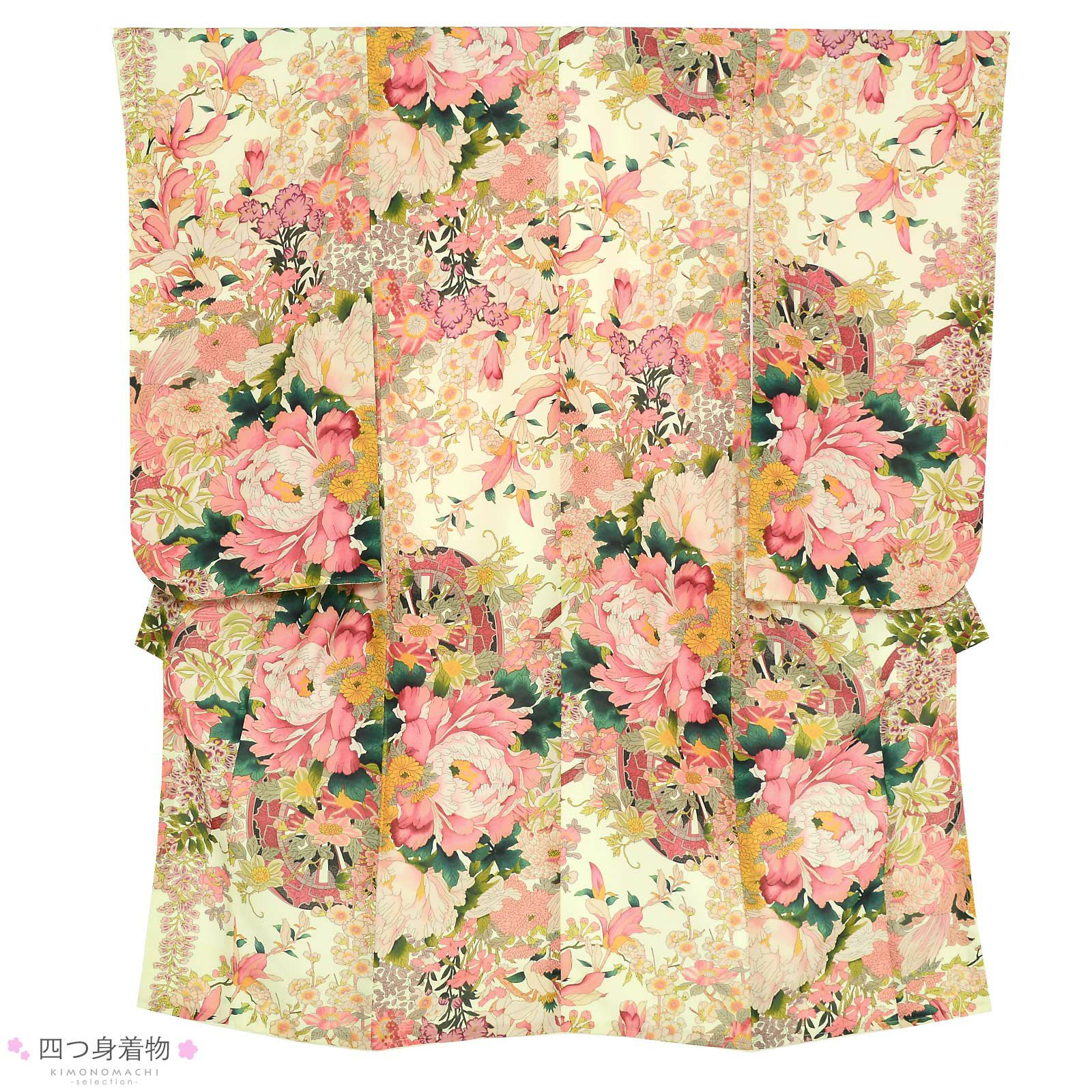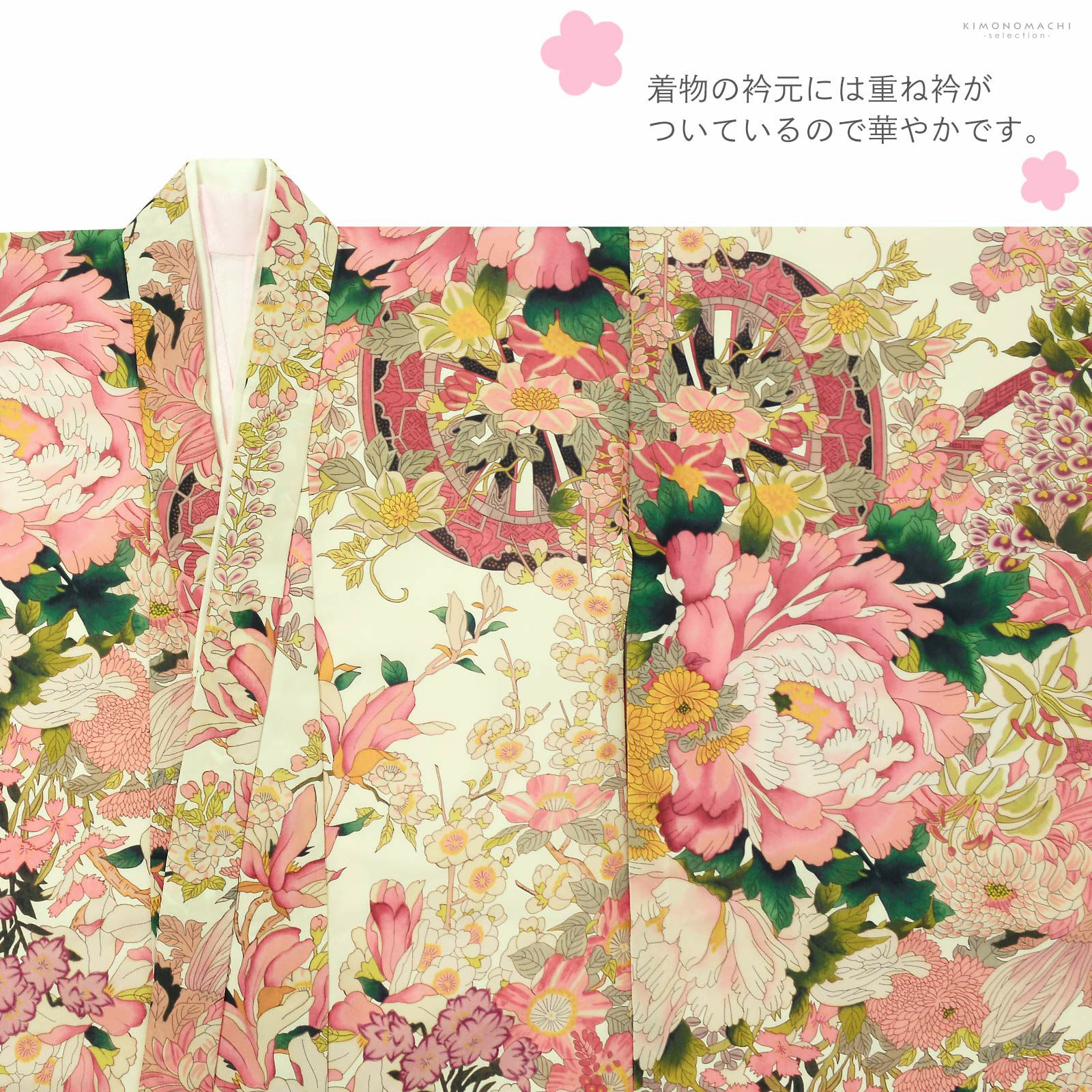 着物:ごく淡い黄緑の地に、細やかな輪郭線で表現された花車文様。大輪の牡丹をメインに百合、梅や菊、鉄線花、撫子、木蓮、藤の花房など四季の花に飾られた車が、ピンクや橙色、濃い桃色、薄ピンク、紫に深緑や抹茶色などの配色で表現されています。重ね衿はオフホワイト。薄ピンクの長襦袢。