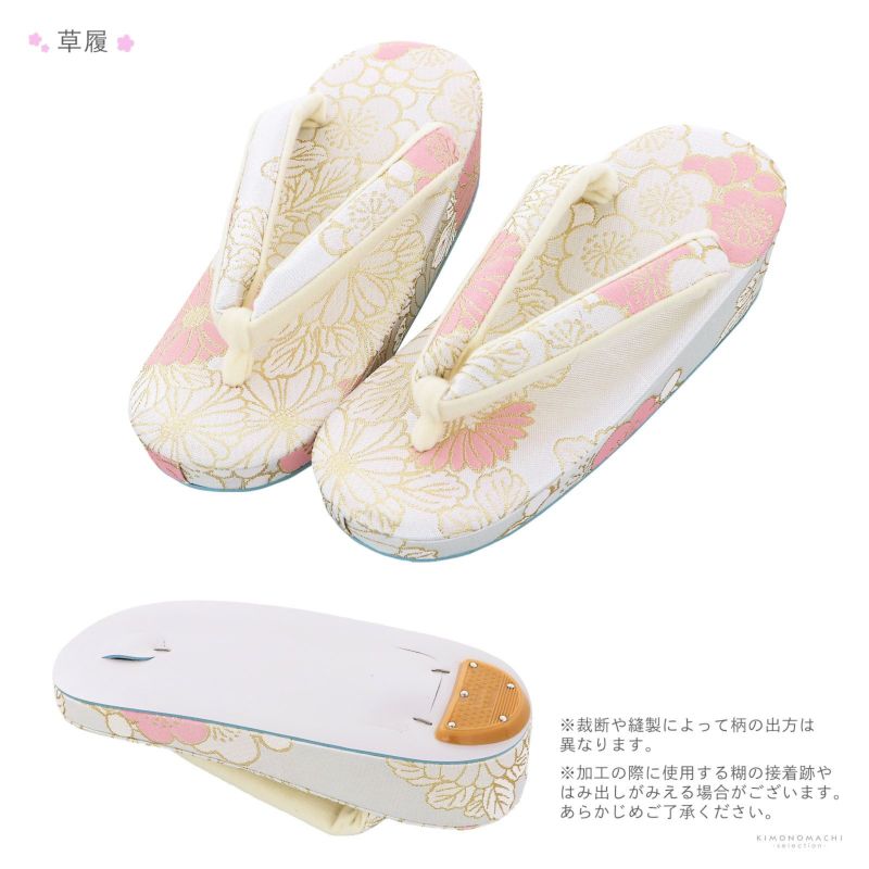 草履:台全長約21.5cm / 幅約7.7cm / 鼻緒幅約1.6cm / かかと高さ約5cm