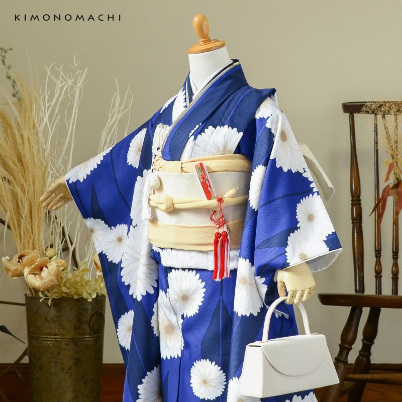 【色柄】細かな地模様のある生地。あざやかな青の地に紺の矢羽根、白に淡いベージュのぼかしの大小の菊の花。ハッキリと冴えた色合いとアンティーク調の大胆な柄行が魅力です。裏地はオフホワイト。
