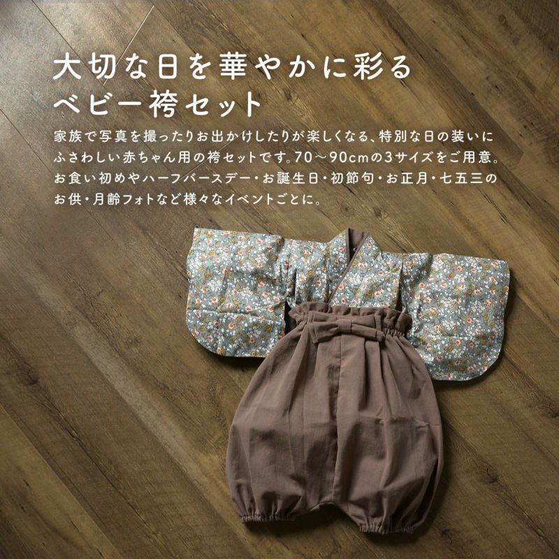 家族で写真を撮ったりお出かけしたりが楽しくなる、特別な日の装いにふさわしい赤ちゃん用の袴セットです。70~90cmの3サイズをご用意。