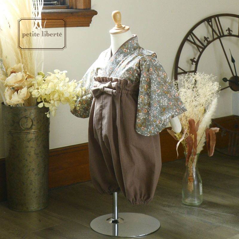 【色柄】着物はあたたかみのあるグレーの地に淡い橙色、白、薄茶色などの野花の模様。浅い茶色の重ね衿。袴は浅い茶色。