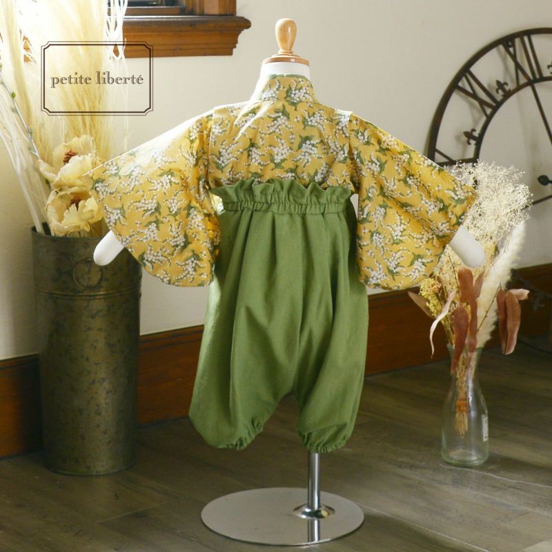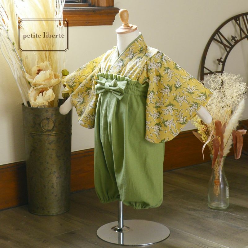 【色柄】着物はややグレイッシュな落ち着いた黄色の地に白と緑のスズラン模様。浅い黄緑の重ね衿。袴は浅い黄緑。