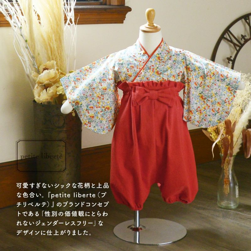 3. ベビー 袴セット 男の子 女の子 petite liberte プチリベルテ「小花 レッド」70cm/80cm/90cm カバーオール ベビー服 子供服 新生児 ひな祭り お食い初め お宮参り【メール便不可】