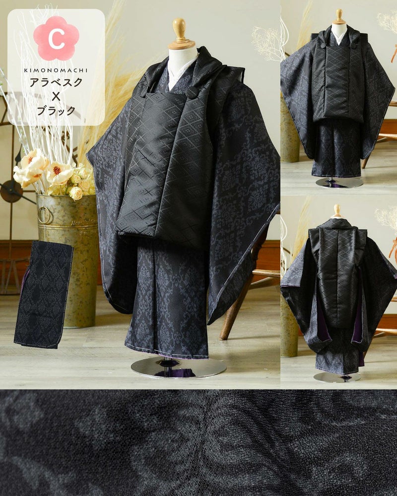 C.アラベスク ブラック:細かな地模様のある生地。黒地にグレーのアラベスク文様。菱形の唐花に立涌状に伸びる蔓草文様とモノトーンの配色が、華やかさとミステリアスな魅力を放つデザインです。裏地は紫。