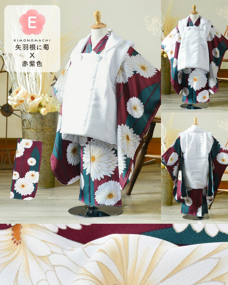 E.矢羽根に菊 赤紫色:細かな地模様のある生地。落ち着いた赤紫色の地に深い青緑の矢羽根、白に淡いベージュのぼかしの大小の菊の花。深い色合いとアンティーク調の大胆な柄行が魅力です。裏地は浅いターコイズ。