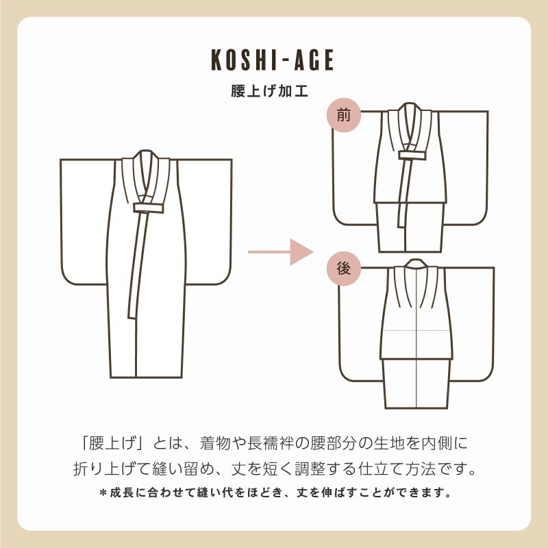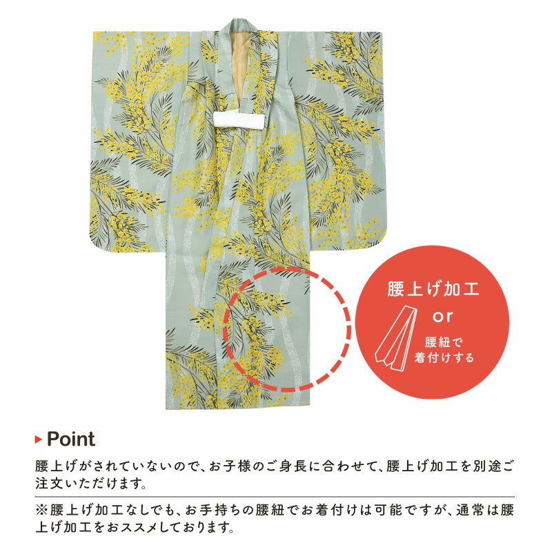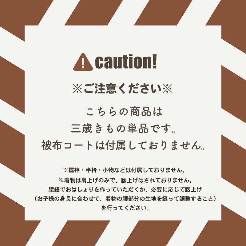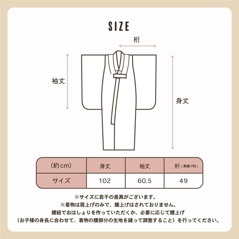 ※着物は肩上げのみで、腰上げはされておりません。腰紐でおはしょりを作っていただくか、必要に応じて腰上げ(お子様の身長に合わせて、着物の腰部分の生地を縫って調整すること)を行ってください。