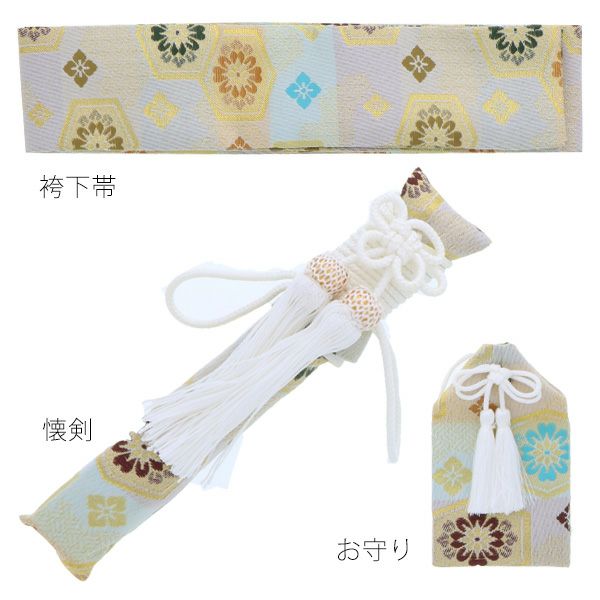 男の子向けの袴、袴下帯、懐剣、お守りの4点セットです。3才、数えの5才、満5才、数えの7才、満7才の5サイズございます。七五三、端午の節句に。