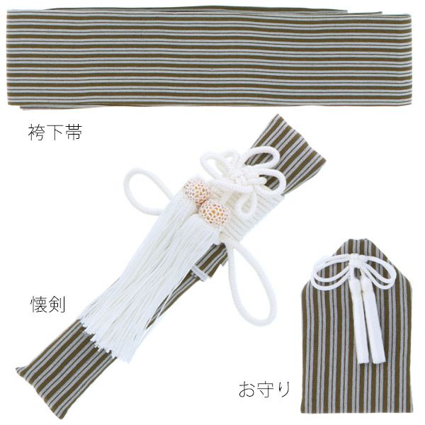 男の子向けの袴、袴下帯、懐剣、お守りの4点セットです。3才、数えの5才、満5才、数えの7才、満7才に。全部で5サイズございます。七五三、端午の節句、卒園式にも。
