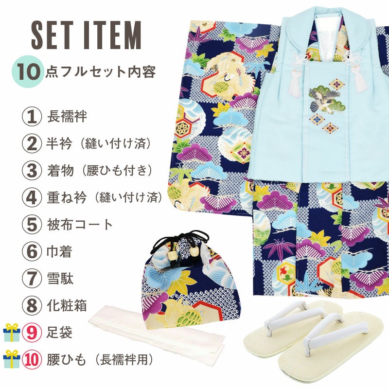 【商品内容】長襦袢・半衿(縫い付け済)・着物(腰ひも付き)・重ね衿(縫い付け済)・被布コート・巾着・雪駄・化粧箱・足袋(プレゼント)・腰ひも(長襦袢用/プレゼント)の10点セット