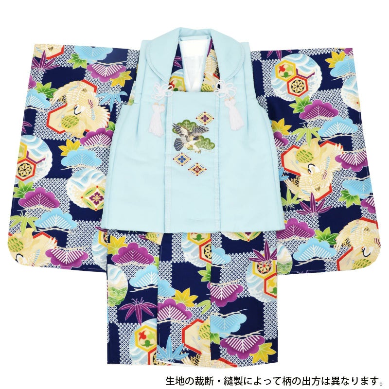 被布コートは水色の地に七宝や松に鷹の刺繍。衿周りに水色の七宝模様のふち取り。着物は紺青と鹿の子模様を市松に配置。赤に淡いベージュの三盛亀甲に金彩の入った鶴と亀。紫、水色、黄、緑の松や笹、楓。淡い水色の重ね衿、白の長襦袢。着物と共生地の巾着。
