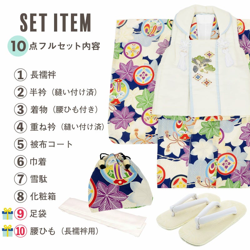 【商品内容】長襦袢・半衿(縫い付け済)・着物(腰ひも付き)・重ね衿(縫い付け済)・被布コート・巾着・雪駄・化粧箱・足袋(プレゼント)・腰ひも(長襦袢用/プレゼント)の10点セット