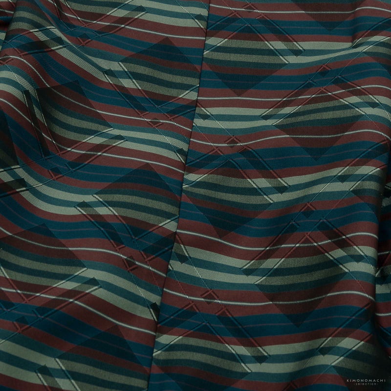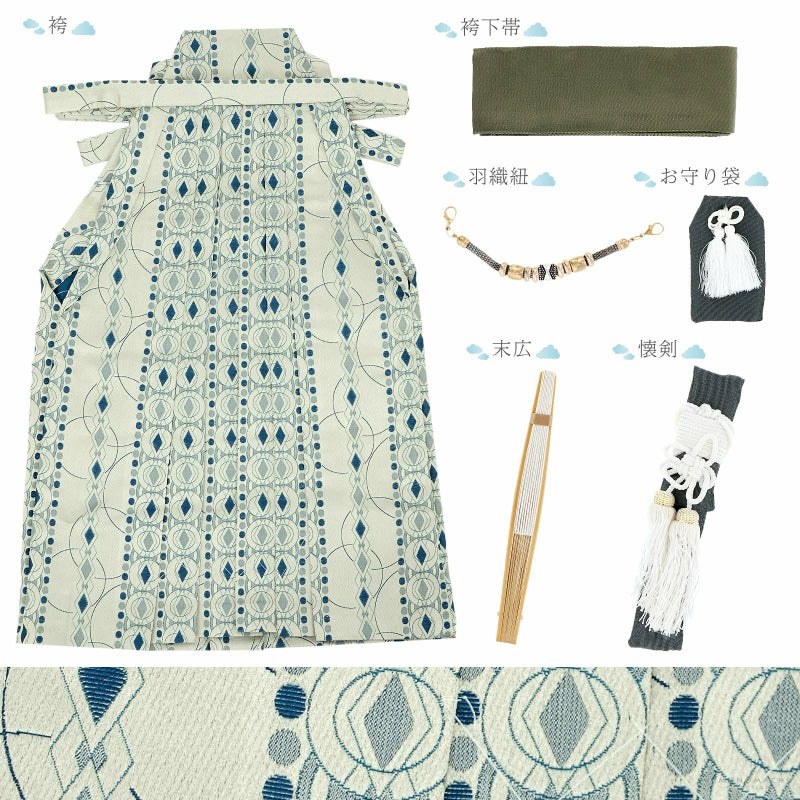 羽織は変わり菱の地模様に、臙脂、ターコイズの横段。全体的に青みの色合いです。着物はブルー。浅い水色の重ね衿。白の襦袢がついています。袴はグレイッシュな白地にターコイズブルーの丸や菱形を縦に配置した幾何学模様です。共布のモスグリーンの帯と懐剣。メタルパーツの羽織紐。白い鼻緒の草履のセットです。