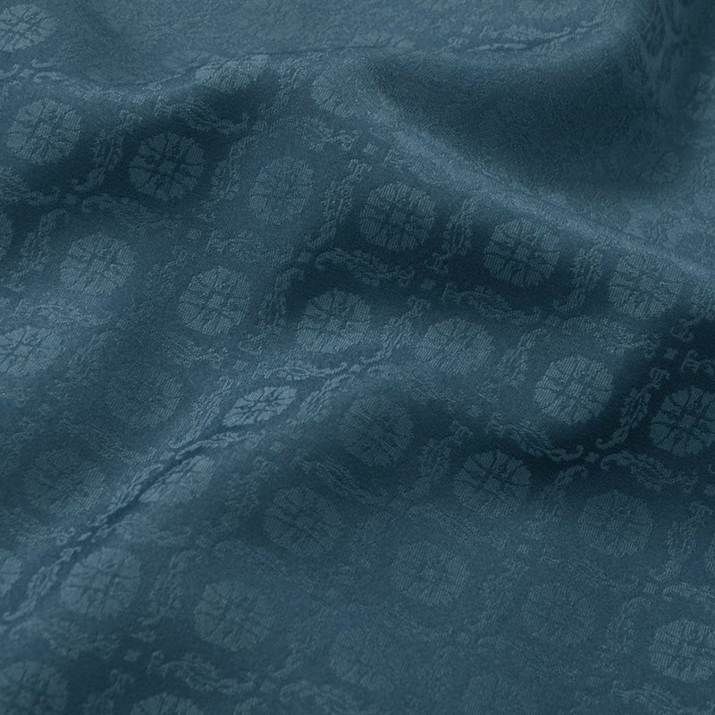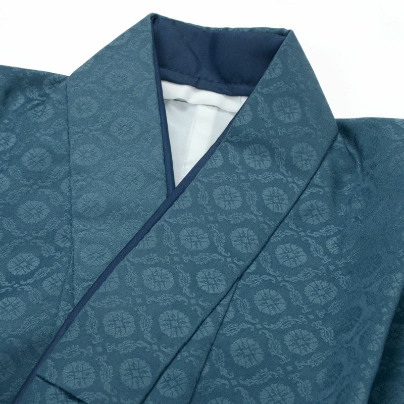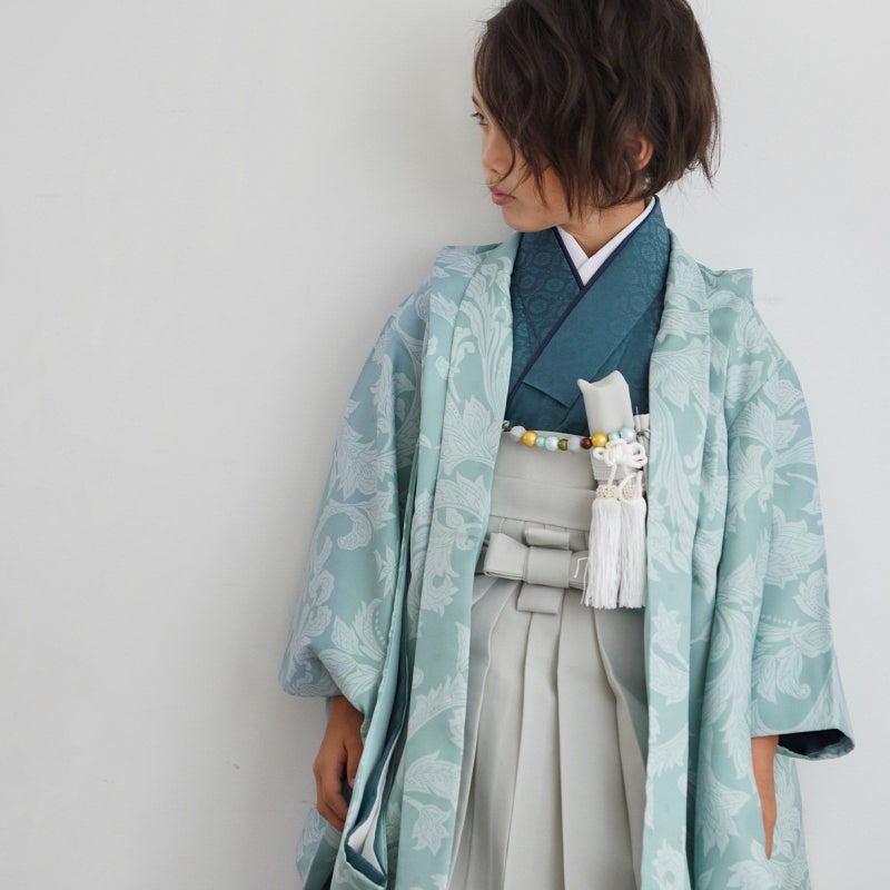 羽織は四角いドットの地模様、やや灰みの水色の地に薄水色の唐草文様。着物は浮線綾の地模様、色はグレイッシュな深い青。深い紺の重ね衿。白の襦袢がついています。袴は淡いグレー。袴と共布の帯と懐剣。カラービーズの羽織紐。オリエンタルな柄をクールな雰囲気にまとめたセットです。