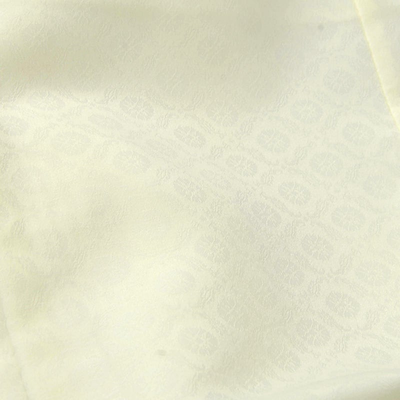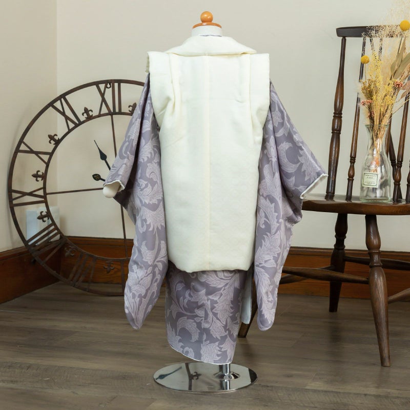 被布コートは浮線綾の地模様、色は淡いクリームイエロー、共布のくるみボタンが付いています。着物は四角いドットの地模様、グレーの地にわずかに赤みの薄グレーの唐草文様。重ね衿はグレーベージュ。白い半衿付きの長襦袢。オリエンタルな柄をモダンな雰囲気にまとめています。