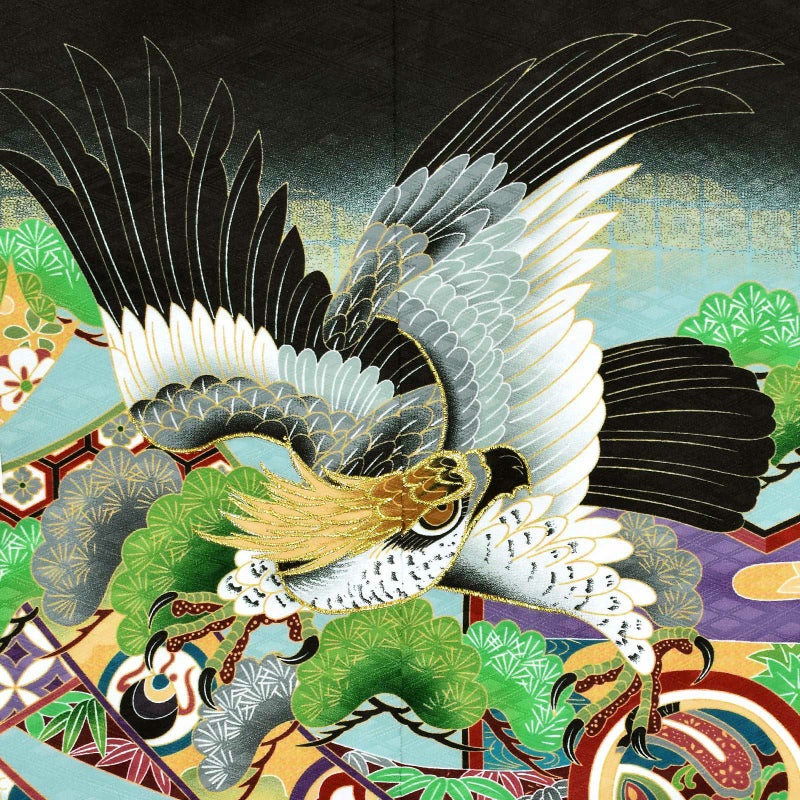 羽織は四つ割菱の地模様のある黒地に、淡いくすんだ水色の腰替わり。黒に青灰色、白の翼を広げた鷹。黄土色や深緑色、紺、海老茶色、くすんだ紫色などの配色の蔓帯や屏風。鼓や宝尽くし紋、松や楓。ポイントに金の刺繍。豪壮かつ煌びやかな中に、典雅な雰囲気を湛えています。着物は黒の四つ割菱の地模様。白の襦袢がついています。