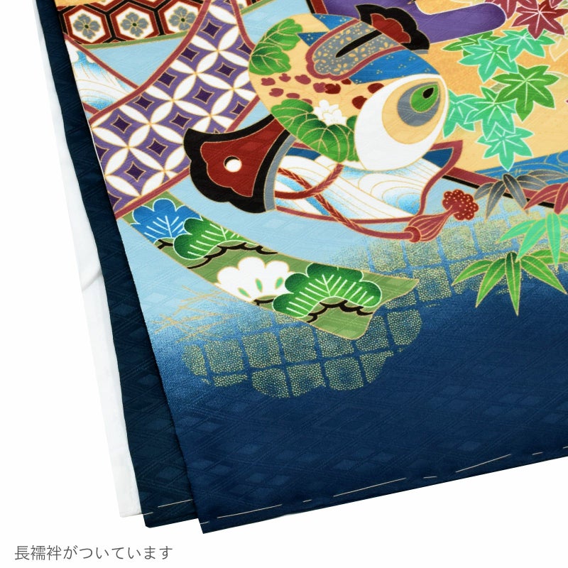 羽織は四つ割菱の地模様のある紺地に、淡いくすんだ水色の腰替わり。黒に青灰色、白の翼を広げた鷹。黄土色や深緑色、紺、海老茶色、くすんだ紫色などの配色の蔓帯や屏風。鼓や宝尽くし紋、松や楓。ポイントに金の刺繍。豪壮かつ高雅な雰囲気に煌びやかさがあります。着物は濃い藍色の四つ割菱の地模様。白の襦袢がついています。
