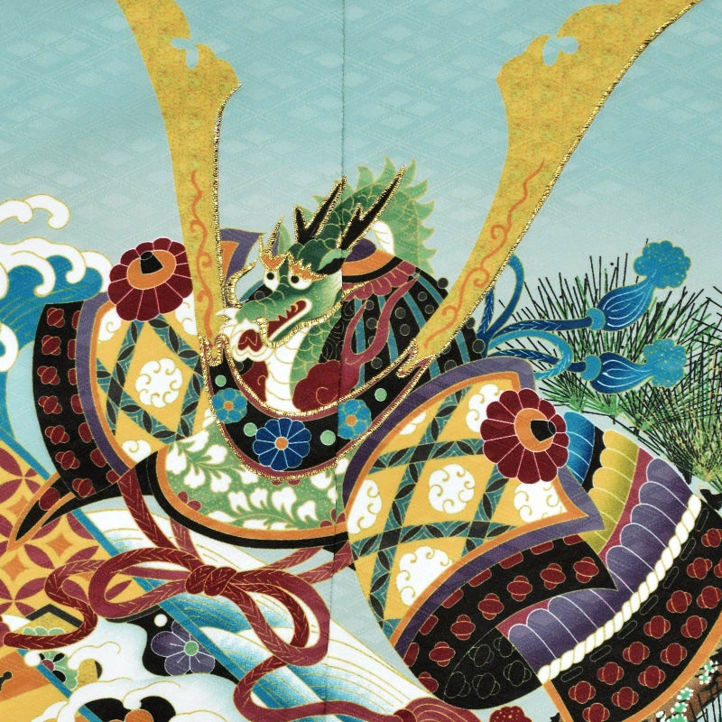 羽織は四つ割菱の地模様に、淡い灰みの水色、黒の裾ぼかし。波に浸かった黄土色や深緑色、紺、海老茶色、くすんだ紫色などの配色の片輪車文。その上にはポイントに金の刺繍がほどこされた龍頭の兜。軍配や笠、宝尽くし紋など。現代的な洒落た色み、勇壮な意匠に煌びやかさが添えられています。着物は黒の四つ割菱の地模様。白の襦袢がついています。